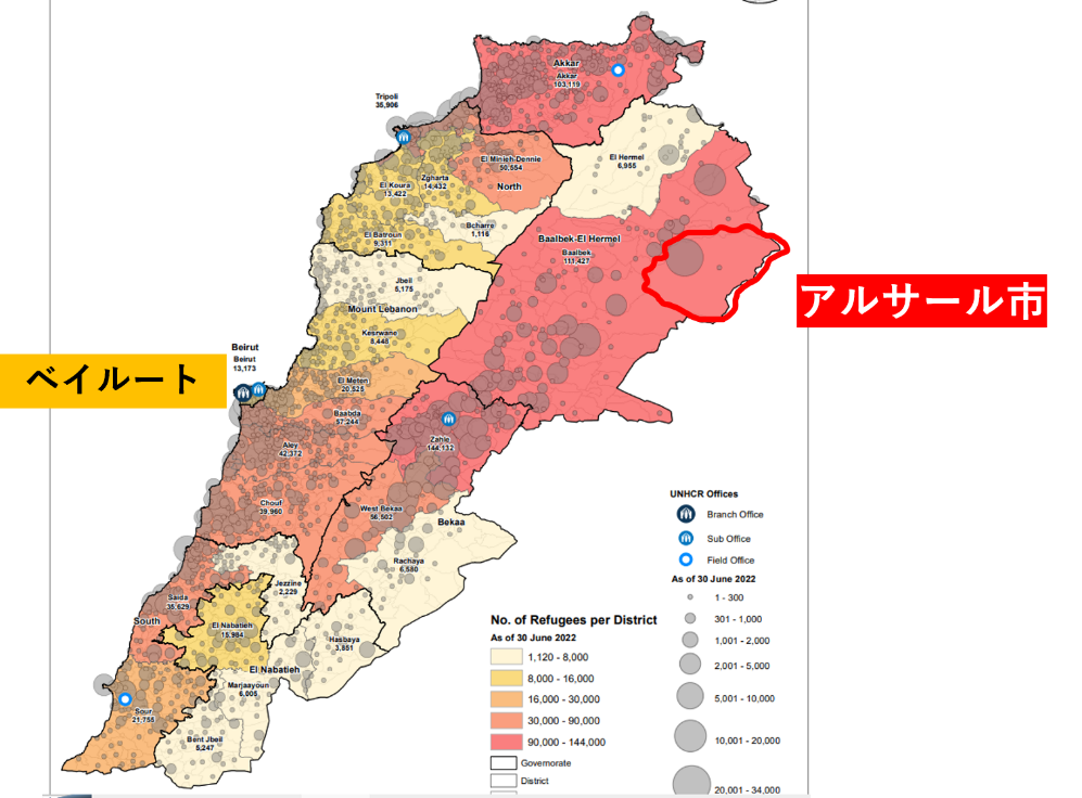 レバノンには、岐阜県と同じぐらいの面積に人口約600万人が住んでいますが、そのうちシリア難民は150万人いるといわれています。アルサールのあるバアルベック地方はシリア難民の数が多く、アルサールはバアルベック地方のなかでも特にシリア難民の多いエリアです。