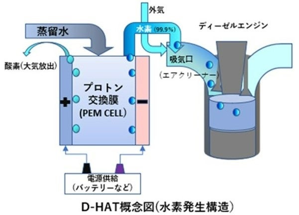 世界的な脱炭素の流れが加速する環境下、自動車分野ではEV化、FCV化が進んでいます。大型ディーゼルエンジンを有する車両についてはコストやバッテリーの供給事情により、普及には時間を要する事が想定され、カーボンニュートラル(CN)の実現を目指すうえで、現行ディーゼルエンジンにおいてもCO2削減策が必要であると判断し、『D-HAT™』を利用した燃費向上によるCO2削減効果検証の実証実験を行うことと致しました。『D-HAT™』は米国内で特許を取得した高効率なプロトン交換膜式の水電解装置(PEMセル)にて水素を生成し、エンジンに送り込む事で、ディーゼルエンジンの燃焼効率を高め、燃費の改善、PM*¹・NOx*²の削減、車両メンテナンスコストの削減が期待されています。
