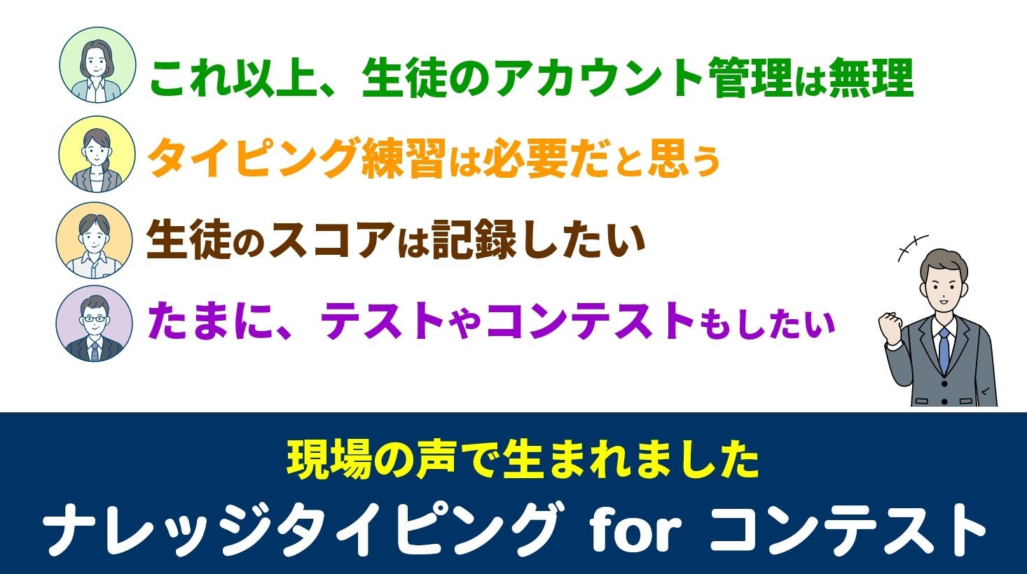 タイピング学習のモチベーション向上のためにコンテストを開催したいと考えている学校は多いのですが「どのタイピングサイト?」「スコアはどうやって把握?」「アカウント管理は?」「表彰状は?」などの課題があり、実行に移すのが難しい状況です。