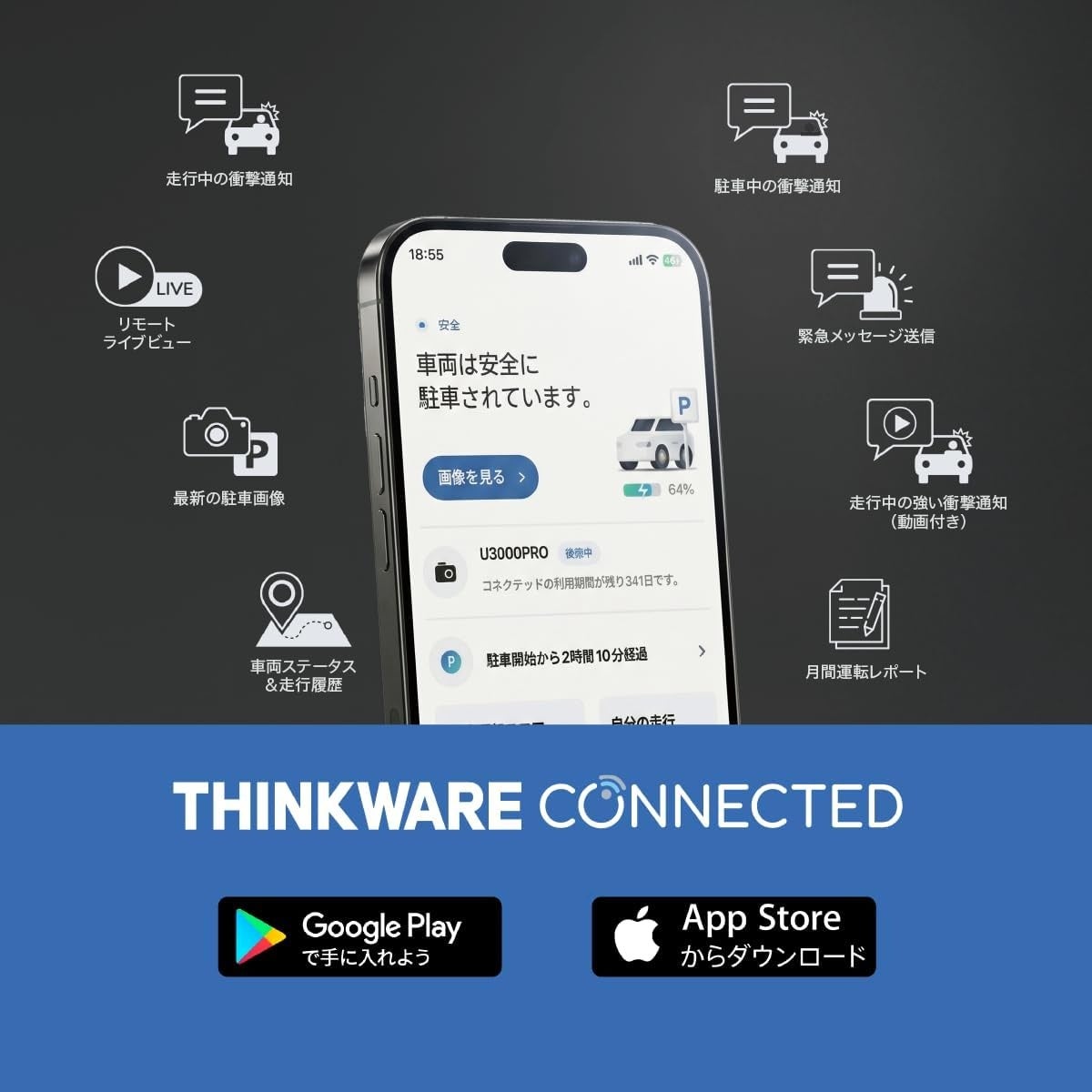 本セットに含まれるLTEモジュール(USIM付き・3年間Basicプラン無料)をU3000 PRO本体に接続することで、スマートフォンアプリ「THINKWARE CONNECTED」から以下の機能をご利用いただけます。