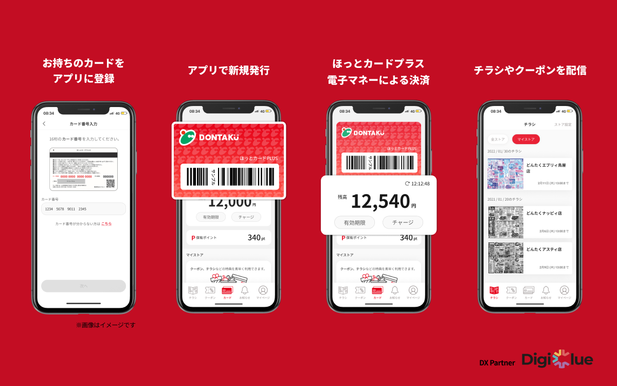 公式アプリでは、デジタル会員証発行、ほっとカードPLUS電子マネーによる決済、お買い物時に付与されるどんたくポイントや電子マネー残高の確認を行えます。また、会員限定クーポンの発行、新商品や電子チラシ情報を配信することで、より便利、お得にどんたくでのお買い物をお楽しみいただけるようになりました。