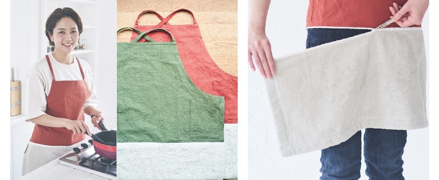 「拭ける」、そして「外せる」。機能性と上質な着心地を追求し生まれた、タオル一体型エプロン 料理家 和田明日香監修「zipron(ジップロン)」