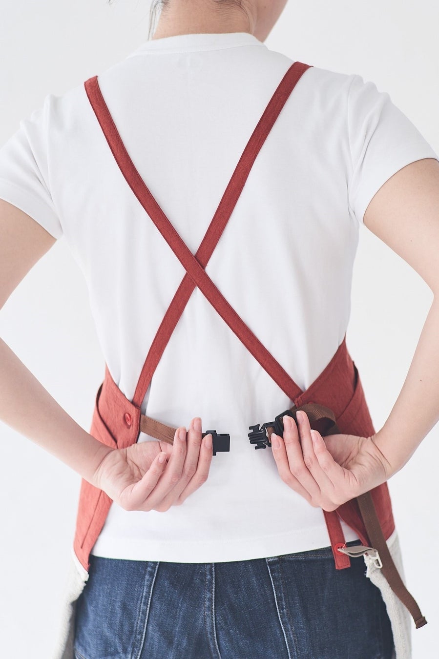 肩紐は首や肩に負担をかけにくいクロスデザインを採用。長時間の着用でも快適です。腰紐はバックル仕様で、紐を結ぶ手間がなく、ワンタッチで着脱が可能。一度長さを決めれば、都度サイズ調整する必要もありません。