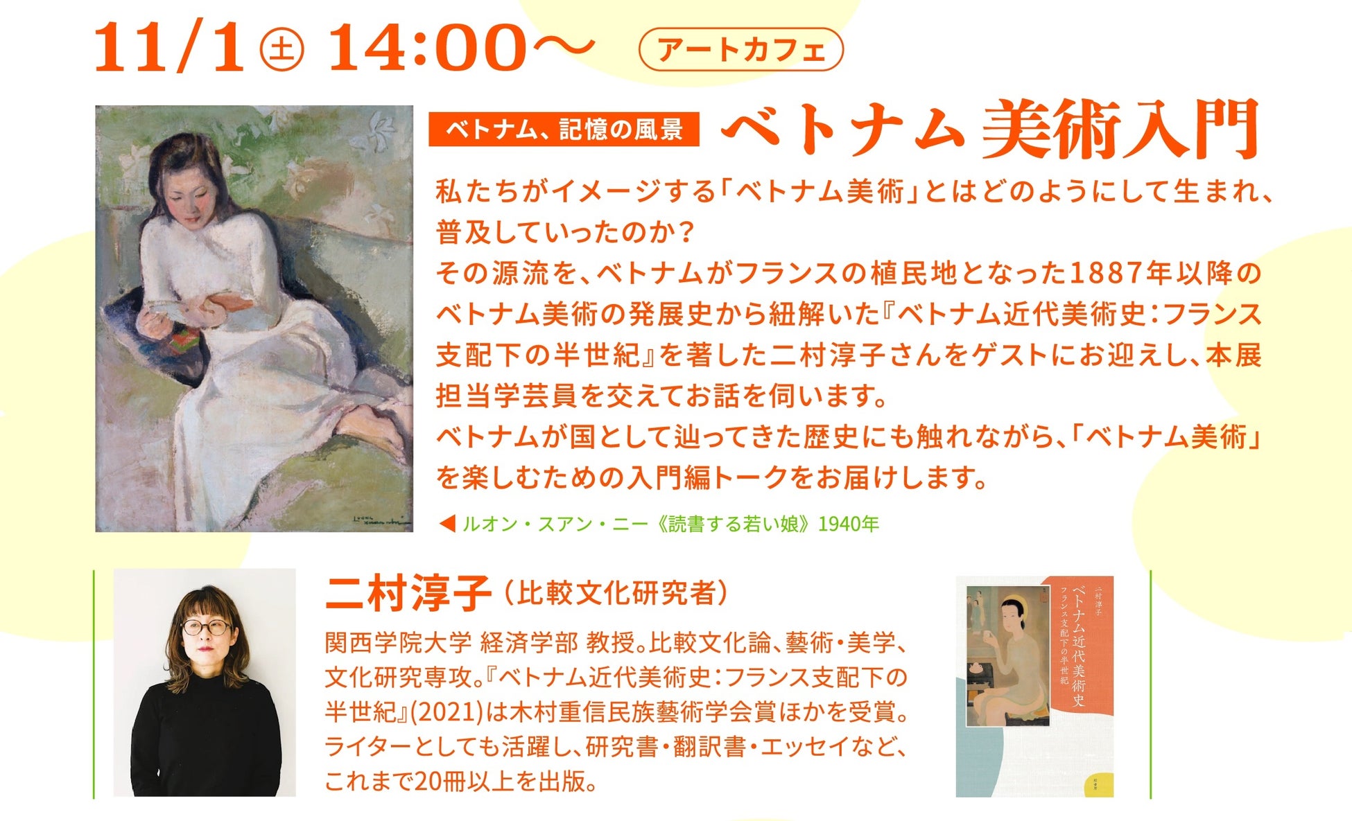 私たちがイメージする「ベトナム美術」とはどのようにして生まれ、普及していったのか? その源流を、ベトナムがフランスの植⺠地となった1887年以降のベトナム美術の発展史から紐解いた『ベトナム近代美術史:フランス支配下の半世紀』を著した二村淳子さんをゲストにお迎えし、本展担当学芸員を交えてお話を伺います。
