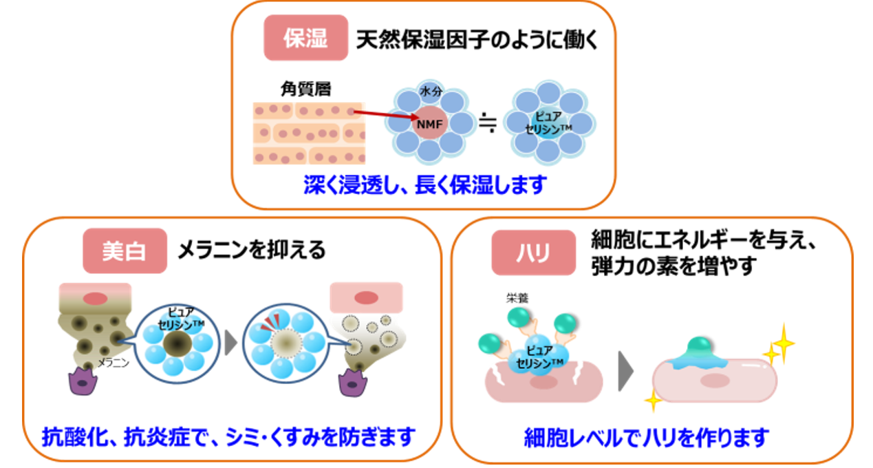 私たちはこれまでに、肌の「保湿」「美白」「ハリ」に着目して、ピュアセリシン™の様々な有用性を明らかにしてきました。シルクのような輝く素肌へ導く力が「ピュアセリシン™のスキンケアテクノロジー」です。
