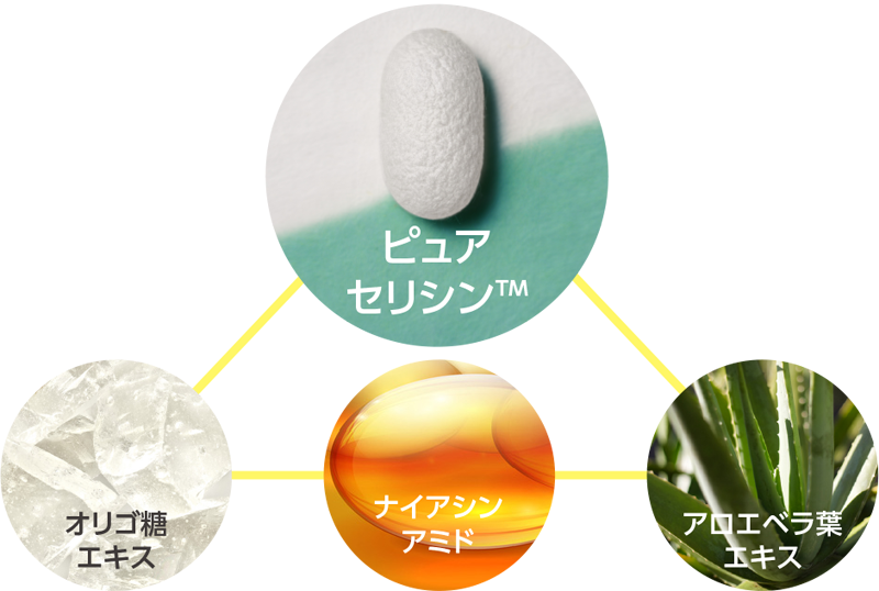 薬用有効成分のナイアシンアミドがしわ改善、シミ予防に働きかけ、ピュアセリシン™、オリゴ糖エキス、アロエベラ葉エキスの天然成分で、ハリを生み出し、肌の水分量やバリア機能をアップさせ、大人の3大悩みを解決します。