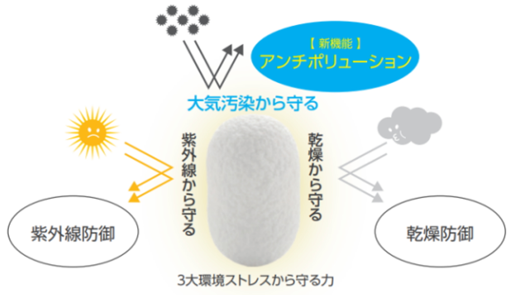 繭は様々な外的ストレスからサナギを守るように、ピュアセリシン™は乾燥や紫外線から肌を守る力が持ちます。ピュアセリシン™が持つ、素肌を守る力が「ピュアセリシン™のプロテクションテクノロジー」です。今回、新しい守る力「アンチポリューション」が加わりました。