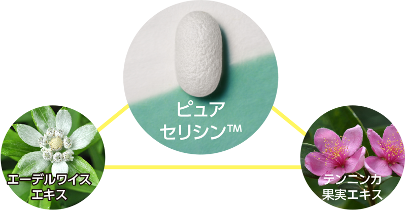 ピュアセリシン™、エーデルワイスエキス、テンニンカ果実エキスの天然成分で、ハリとうるおいがアップ。また、しわやシミの元となる紫外線ダメージからも守ります。つけている間、3大悩みのケア効果を発揮し、素肌の美しさを底上げします。