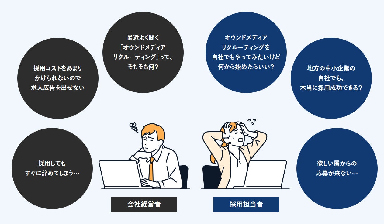 「オウンドメディアリクルーティングを自社でもやってみたいけど、何から始めたらいい?」「地方の中小企業でも、本当に採用成功できる?」など、下記のようなことにお悩みの中小企業・経営者様および採用ご担当者様に見ていただきたいと考えています。きっと、「明日からの採用業務に使えるヒント」に出会えるはずです。