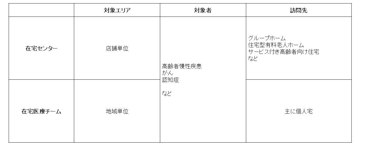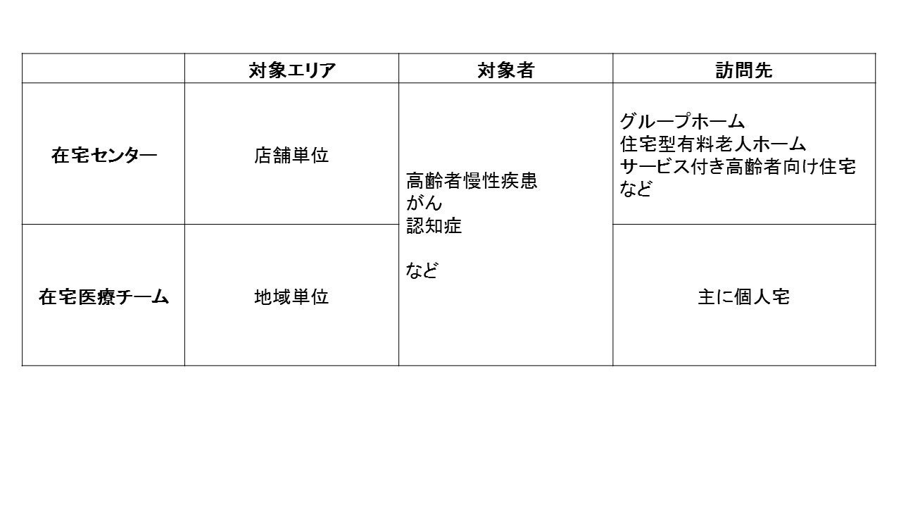 ・札幌在宅医療チーム、埼玉在宅医療チーム、船橋在宅医療チーム、多摩在宅医療チーム、八王子在宅医療チーム