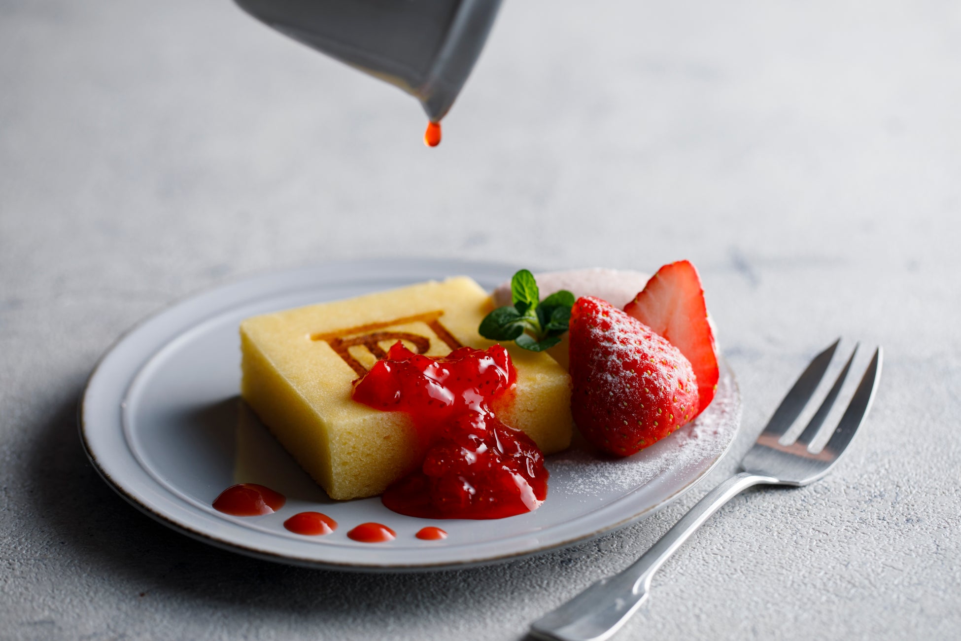 プレーンのクラシックプニーニに合わせるのは、生のいちごをたっぷり使った果肉感たっぷりで爽やかないちごソース。フワッとした甘さ控えめのいちごクリームとの相性も抜群です。