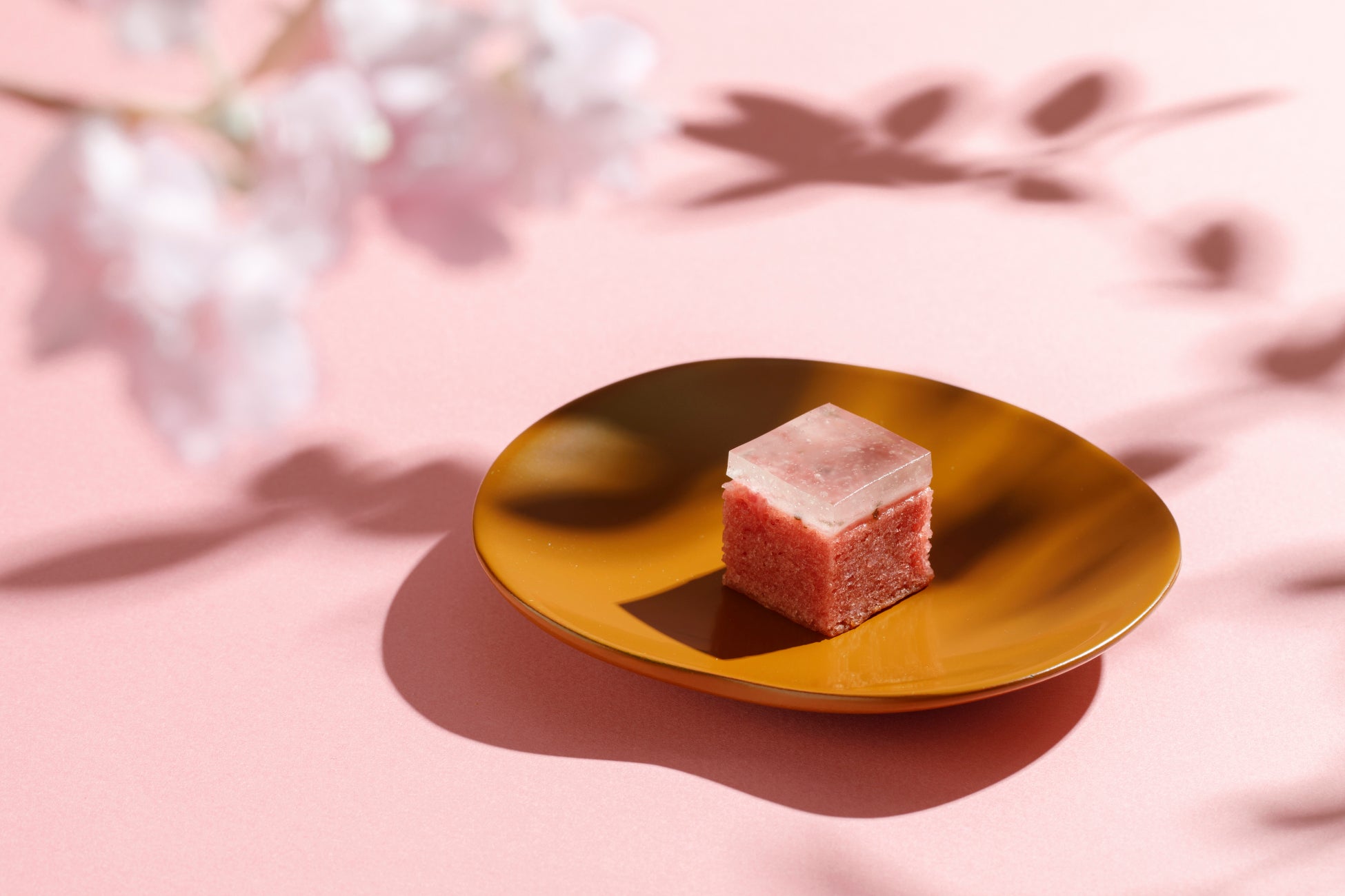 香り高い桜生地に、桜花を散らしたわらび粉入り錦玉羹を合わせました。