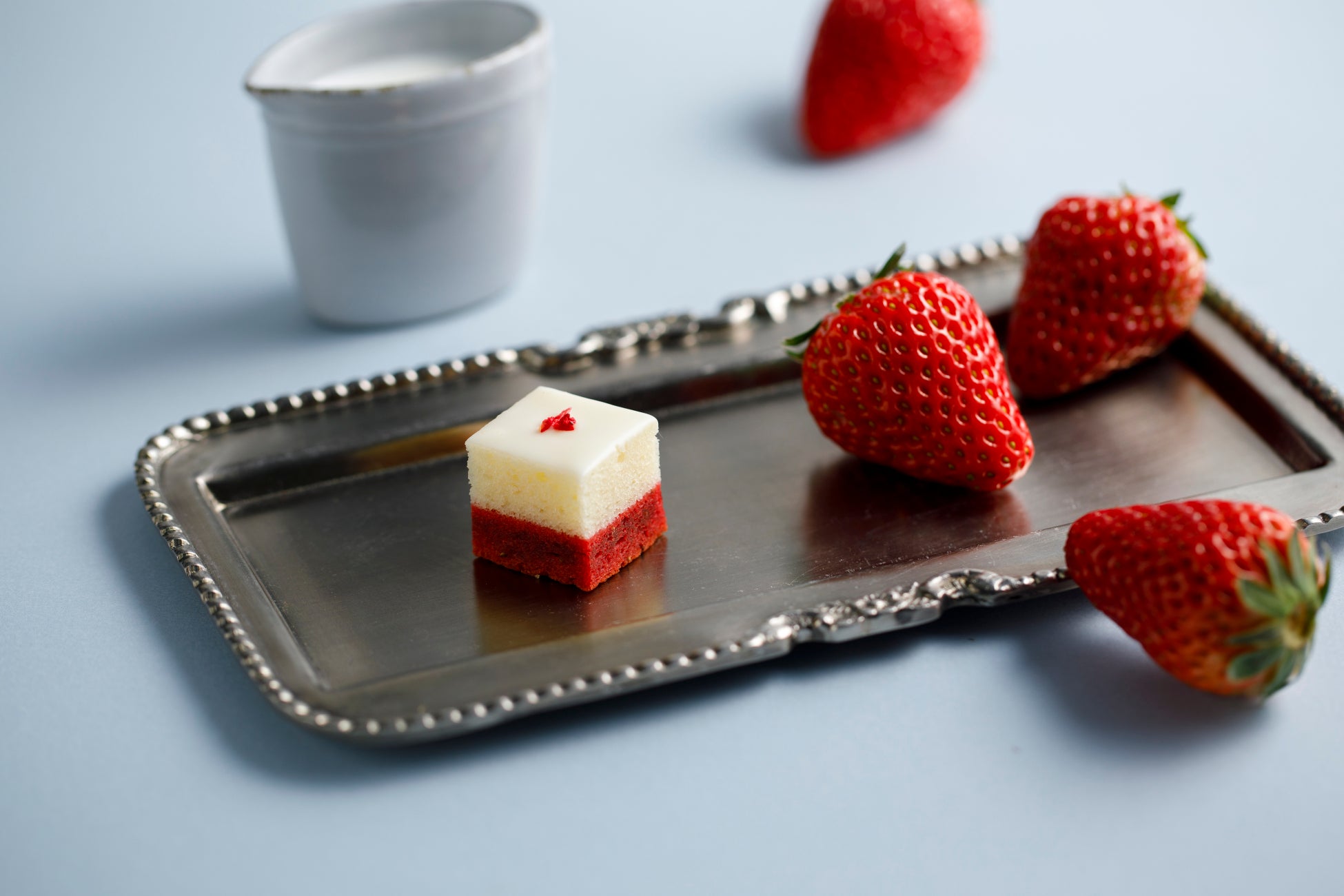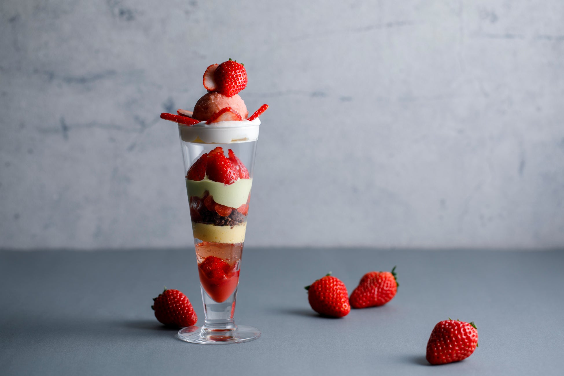 生いちごをたっぷり使用し、いちごの甘酸っぱさと香りが口の中いっぱいに広がるパフェです。メレンゲのサクサク食感とロゼワインジュレの大人の味わいに、気分まで春めきます。