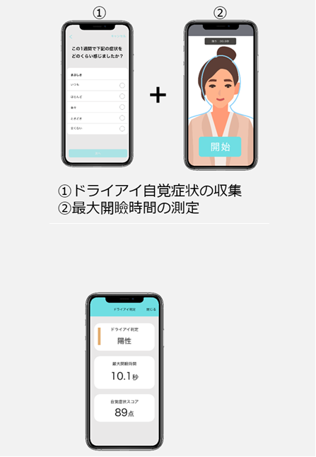 本研究では、InnoJin株式会社が開発したドライアイ診断補助用スマートフォンアプリケーション (DEA01)を用いて、ドライアイ疾患特異的質問紙票 (J-OSDI)*5によるドライアイ自覚症状の収集と最大開瞼時間*6測定を組み合わせた非侵襲的・非接触的なドライアイ診断補助機能(図1)のドライアイ診断能を評価します。生体染色や細隙灯顕微鏡による検査を必要としないスマホアプリによるドライアイ診断補助が実現できれば、眼科の遠隔診療・オンライン診療の場においても自覚症状以外の指標によるドライアイの定量的な評価が可能となります。