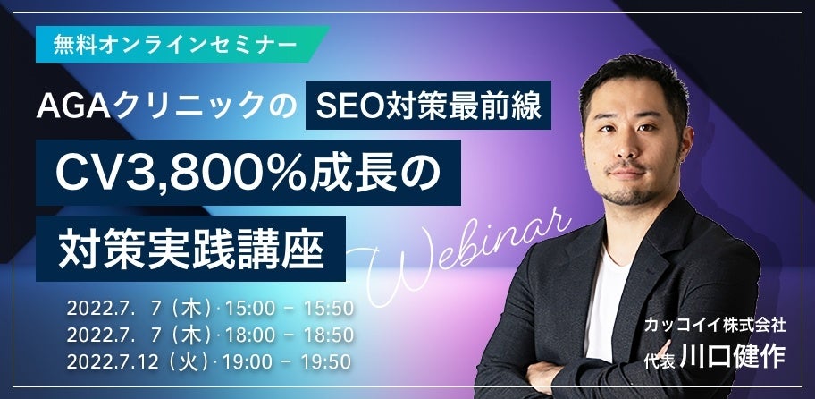 QOOSO PLAN株式会社・カッコイイ株式会社の代表を務める川口 健作は、2022年7月にAGAクリニックのためのウェビナー、「AGAクリニックのSEO対策最前線|CV3,800%成長の対策実践講座」を開催いたします。