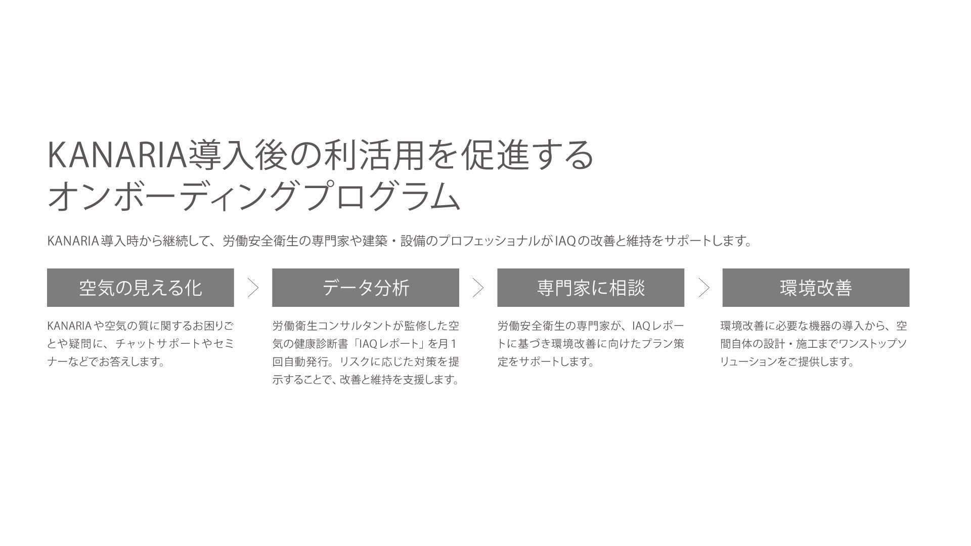 専用WEBアプリ『my KANARIA』で労働安全衛生の視点に基づく空気の健康診断書「IAQレポート」を月1回自動発行します。近年、新たな化学物質管理規制が導入されたことに伴いリスクアセスメントに基づく「自律的な管理」が重要視されていることから、本機能により環境中の有害因子を評価することで労働者に有害物質・作業のリスクを認識させるとともに、必要な防護対策を講じることにつなげられればと考えております。