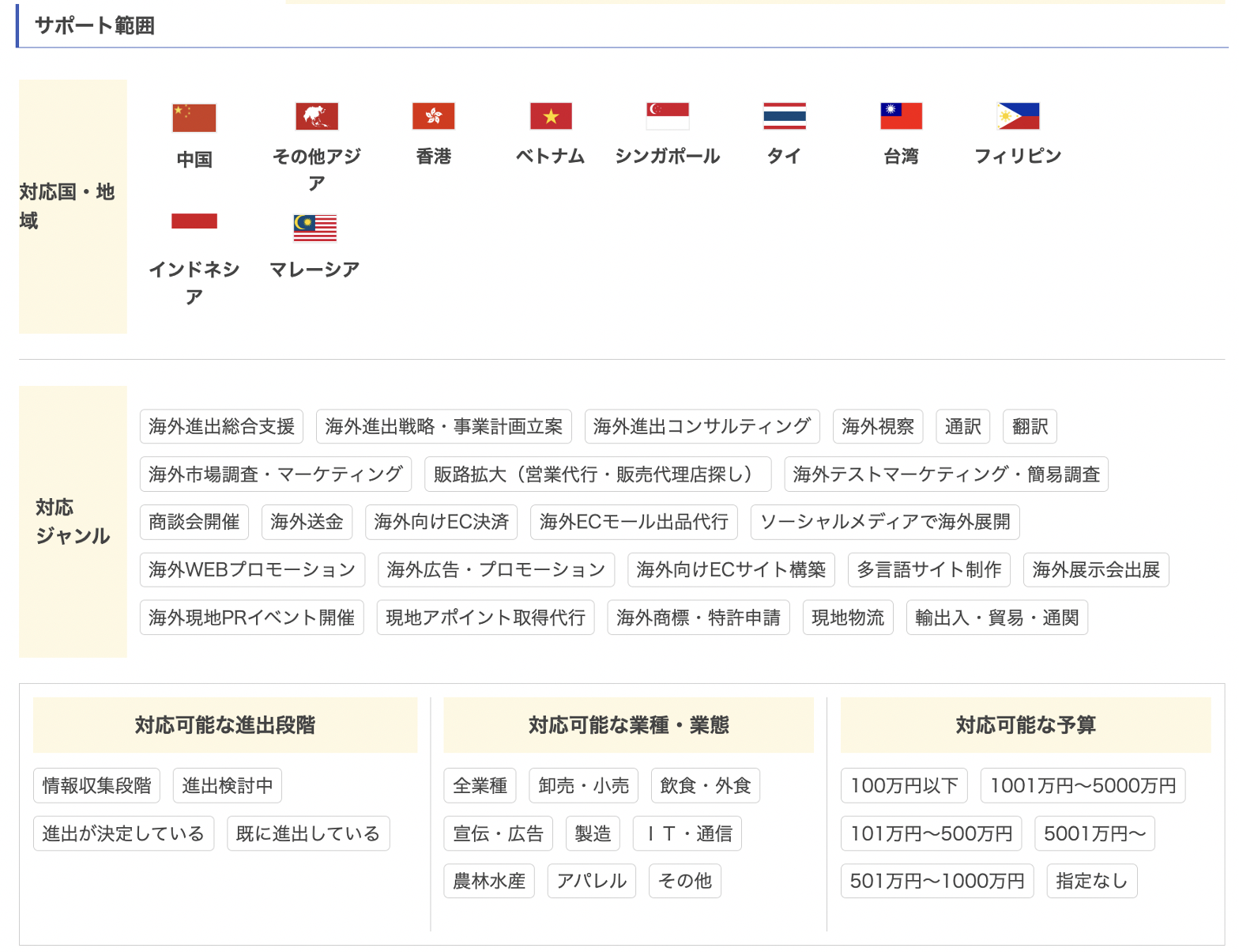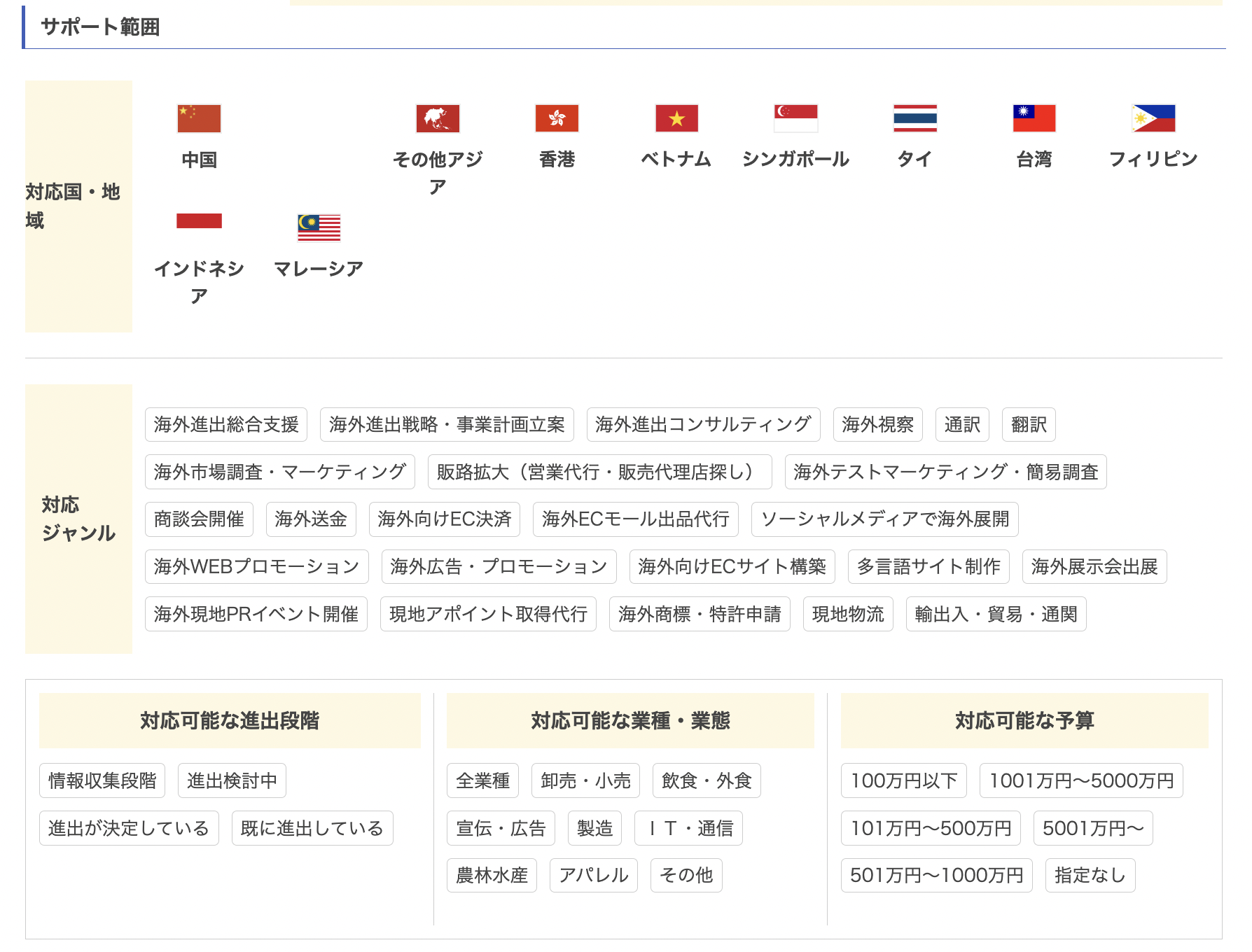 事業内容 :コンサルティング業、各種許可申請代行、販路開拓・営業代行、越境ECサイト運営及び物流代行、プロモーション業、広告代理業、ライセンス・エージェント業、貿易業、卸売業、輸出入貨物取扱業及び通関業、倉庫業