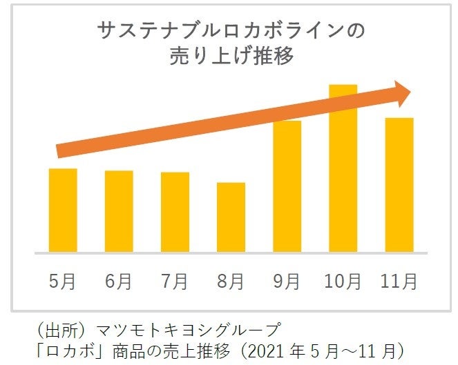 matsukiyo LABの「サステナブルロカボライン」は、昨今の低糖質ニーズの高まりを受け、ロカボライフの新たなシーンを提案していきます。美味しさと低糖質を両立させることに加えて、食物繊維やカルシウムなどの栄養素を多く含むことも目指しています。従来のロカボ基準を満たす商品群に加え、2021年からは「ロカボプラス※」を満たすラインアップも登場しました。シリーズ全体の売上は、2021年11月時点で半年前と比較して約160%に伸長しており、多くのお客様に支持されています。
