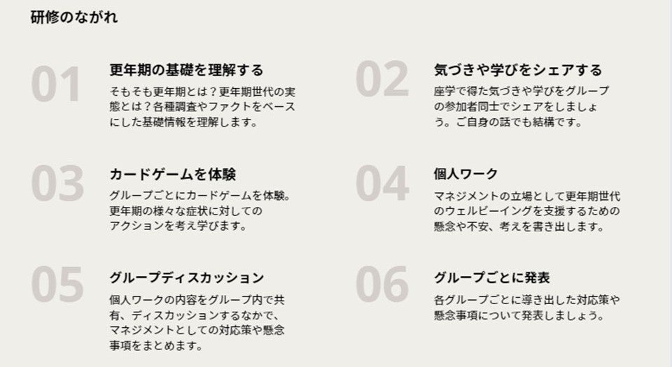 ・当プログラムは「座学+カードゲームワークショップ+チェックシート」によって構成され、受講者それぞれが「更年期の症状があることによってどんな変化や不調があるのか」そして 「それを良くするために、どんなアクションができるのか」を知ること、受講者同士でディスカッションすることで、個人や組織の気づき・対処を促します。