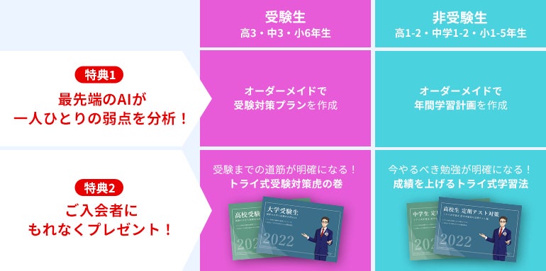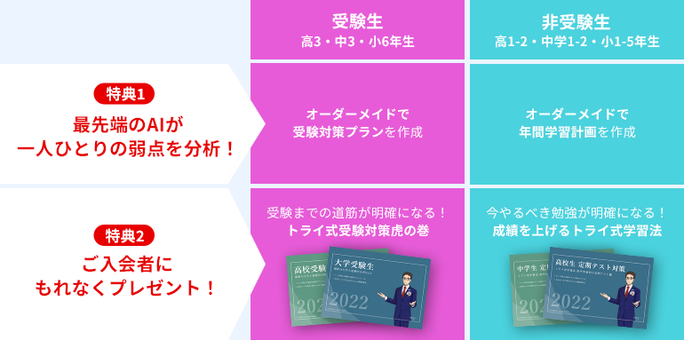 またご入会いただいた方には、最先端のAIを用いた「オーダーメイドカリキュラム」の作成と、特典資料である「トライ式受験対策虎の巻き(受験生向け)」もしくは「成績を上げるトライ式学習法(非受験生向け)」をプレゼントいたします。
