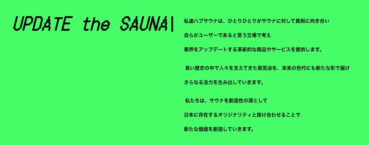 そのミッションのもと、私たちはサウナ業界に新しい風を吹き込み、次世代のライフスタイルを提案し続けてまいります。