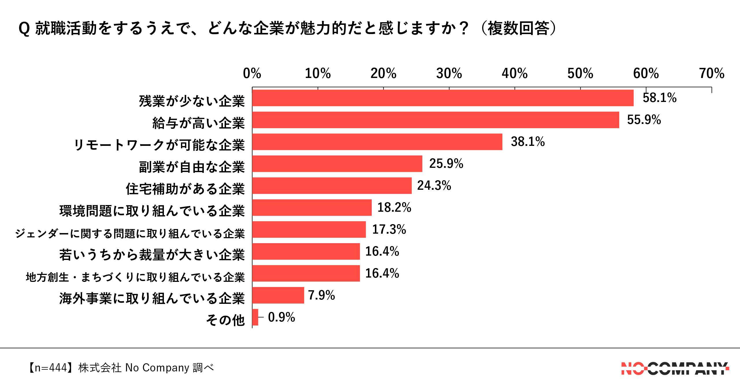 「就職活動をするうえで、どんな企業が魅力的だと感じますか」について、残業が少ない企業(58.1%)と給与が高い企業(55.9%)が共に50%を超える結果となりました。労働時間と給与に関しては高い関心が示されました。一方で、環境問題やジェンダーに関する問題、地方創生などの社会課題へ取り組む企業に魅力を感じると回答する学生も存在し、企業にとっては採用活動を行う上で意識すべきポイントと言えます。