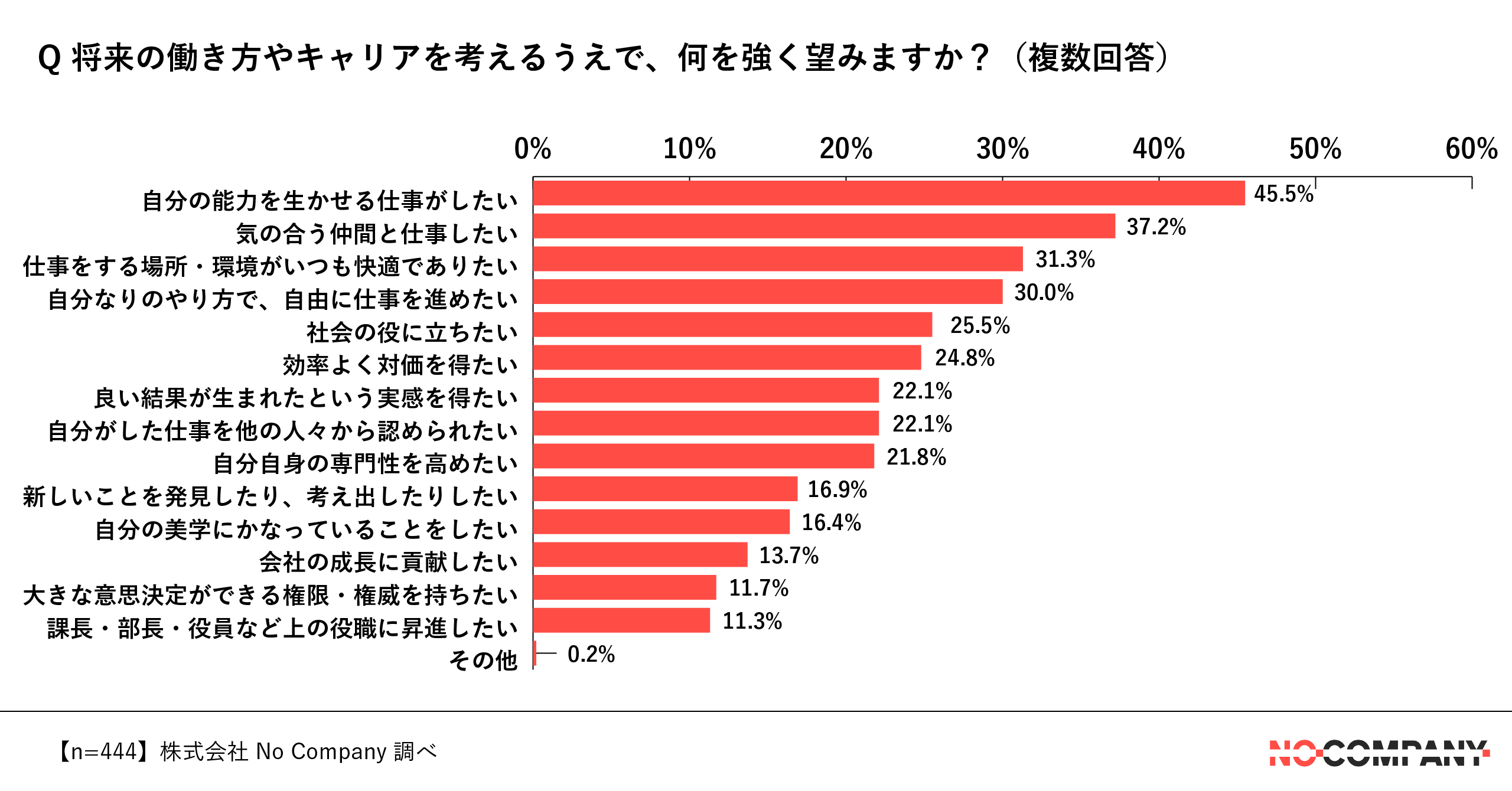 「将来のキャリアや働き方を考える上で何を強く望みますか」について、「自分の能力を生かせる仕事がしたい」が45.5%で最も高い回答となりました。「気の合う仲間と仕事したい」(37.2%)、「仕事をする場所/環境がいつも快適でありたい」(31.3%)が続き、気持ちよく働けることを重視するZ世代の価値観が伺えます。