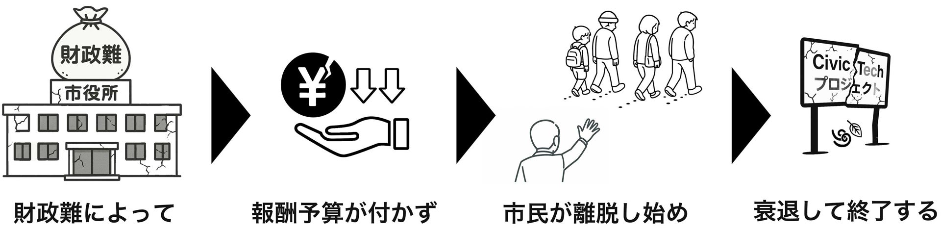 このことは、Civic Techに取り組んだことのある行政・事業者であれば一度は直面する課題です。それにも関わらずこの課題が解けないのは一重に財政難にある行政側の予算不足に起因します。元々Civic Techは業務効率向上による行政コスト削減を目的とするため、如何に少ない予算で高い効果を実現できたかが評価軸として設定されます。そのため、インセンティブの重要性に薄々気付いてはいても目を逸らしてしまい、結果として徐々に市民が去り出したCivic Techプロジェクトではデータが集まらなくなって終了します。
