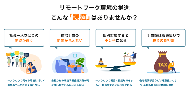 このような課題に対し、備品支給や「リモートワーク手当」の支給などの施策によって解決を図る企業も増えつつあります。しかし一律の備品支給では平等性の担保が難しく、リモートワーク手当では支給された手当がどのように使われているか分からないうえ、報酬扱いのため課税対象となることで会社・社員双方にデメリットがあるなど、本質的な課題解決にはつながっていないのが現状です。