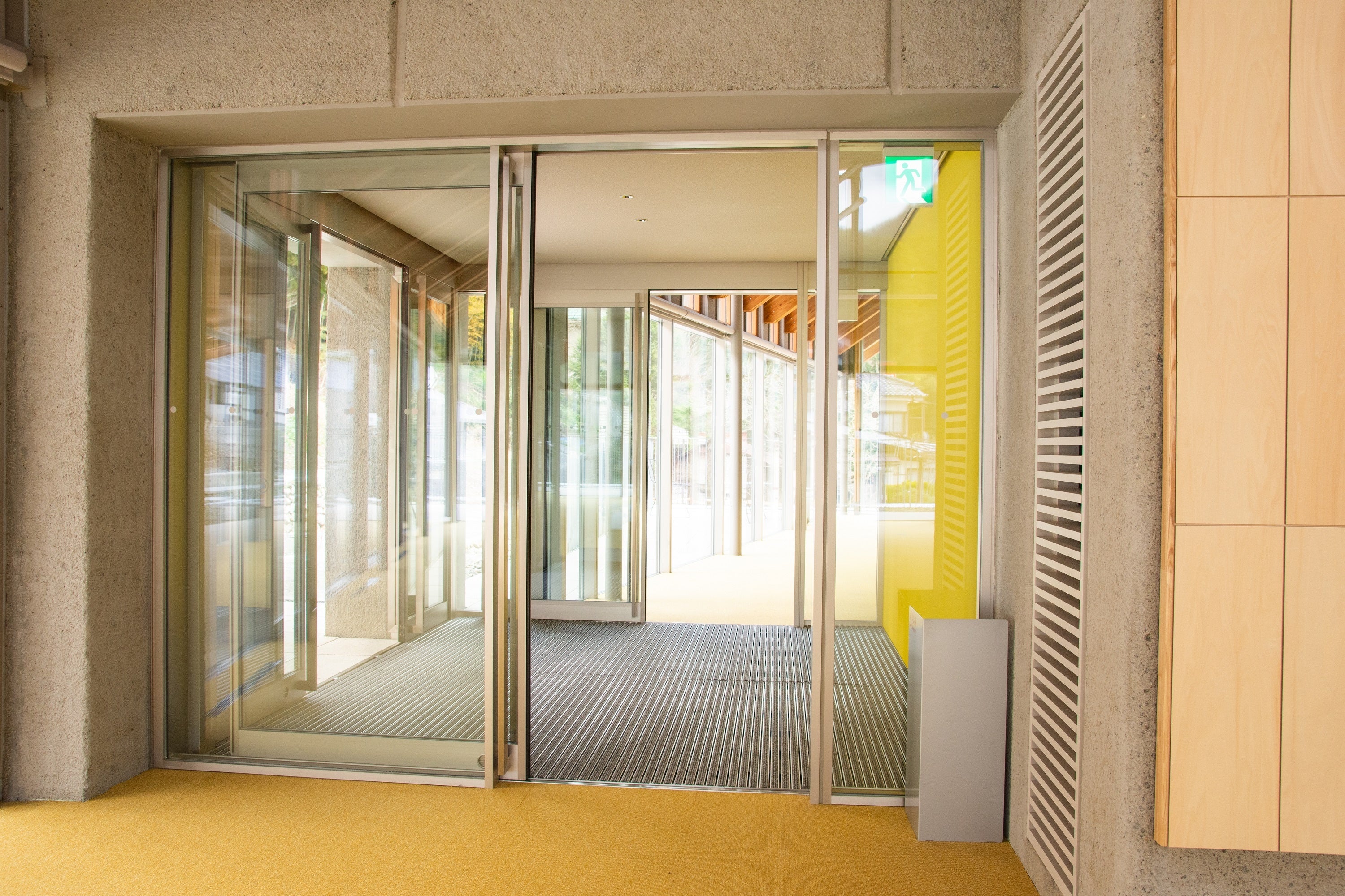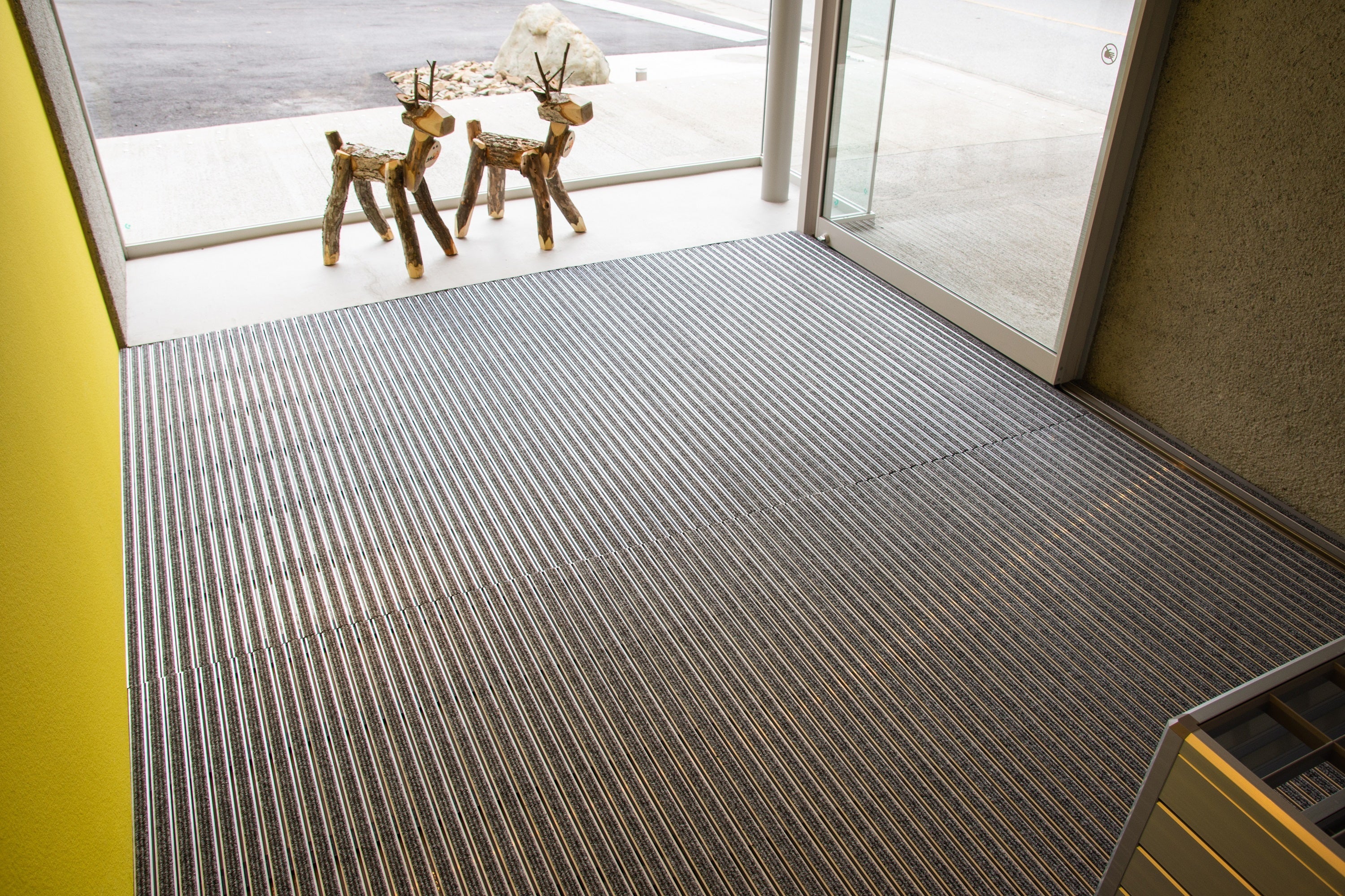 今回採用されたヒガノ製のエントランスマットは、繊維状のマットが土砂や水分の除去性を高め、屋内の汚れを抑えることができます。マット部分のみ交換が可能でメンテナンスが容易なだけでなく、JIS規格に対応したオプションの専用点字鋲を導入すれば、バリアフリーな環境を作ることもできます。エントランスマットにより、すっきりとした納まりを実現し、スタイリッシュな風除室を演出することで、訪れる人々の交流の場や、地域の様々な活動拠点となる新たな施設の価値を高める一助となっています。