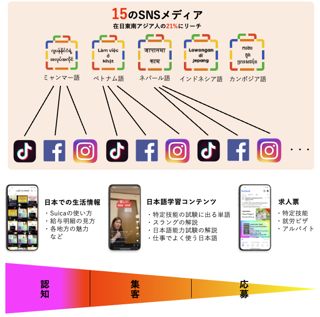 外国人労働者向けのシェアハウスを経営したり、社内もZ世代の東南アジア人スタッフ主体で運営していたりするからこそ、外国人労働者の使用シーンに合わせローカライズさせた集客方法が可能となり、ミャンマー・ベトナム・インドネシア・ネパール・カンボジアの言語でFacebook・Instagram・TikTokそれぞれでメディアを運営しています。(ミャンマー語メディアは国内最大級の求人メディアとなっています。)そのSNSマーケティング力があるからこそ国外ではなく、国内在住の日本語力の高い人材を、素早くご紹介することが可能となっています。