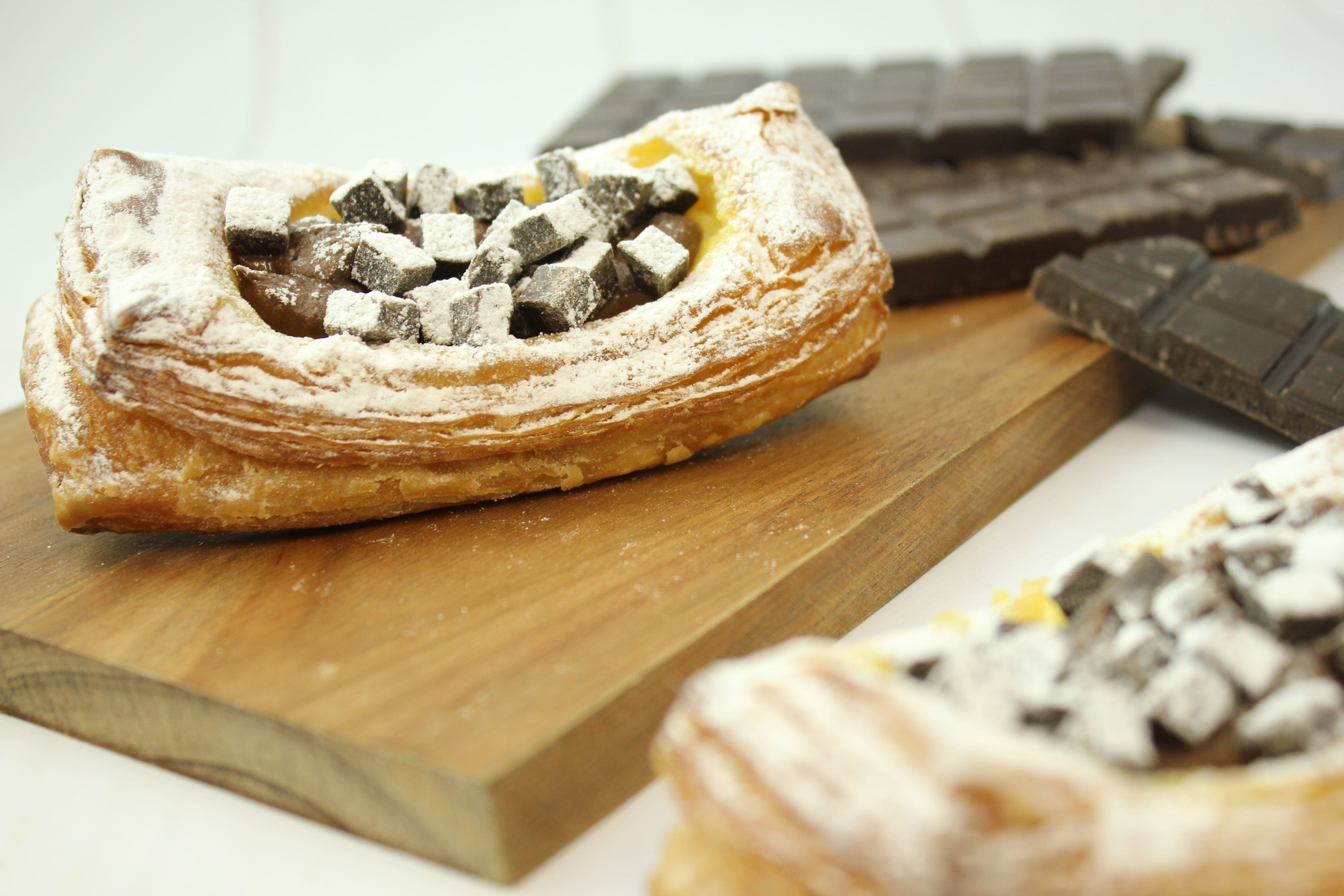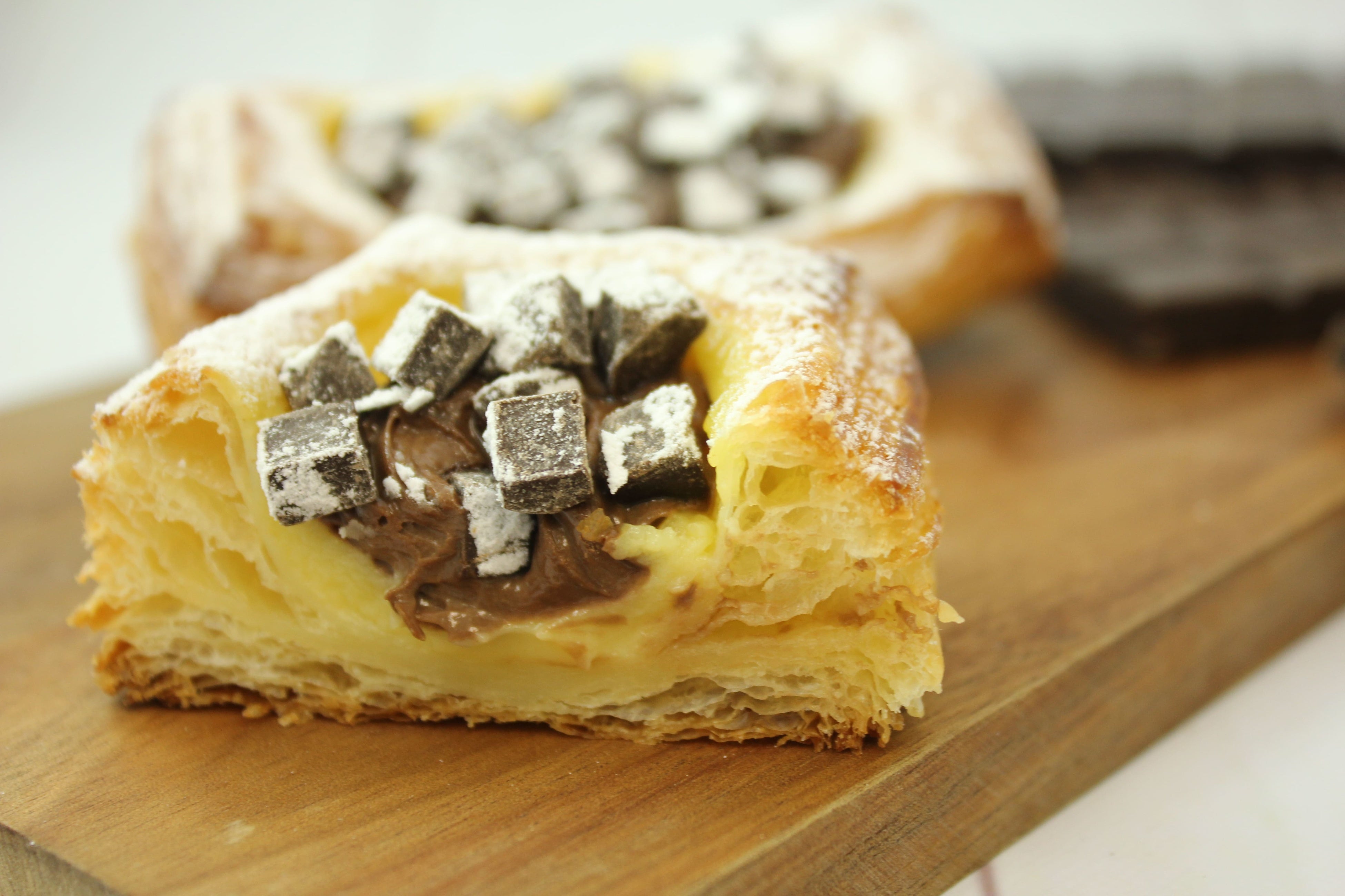 さっくりデニッシュになめらかなカスタードクリームを絞って焼き上げ、ベルギー産クーベルチョコレートを使用したやわらかなチョコレートクリームと、チャンクチョコをトッピング。カスタードとチョコレートの2種類のクリームがとろける贅沢な組み合わせです。