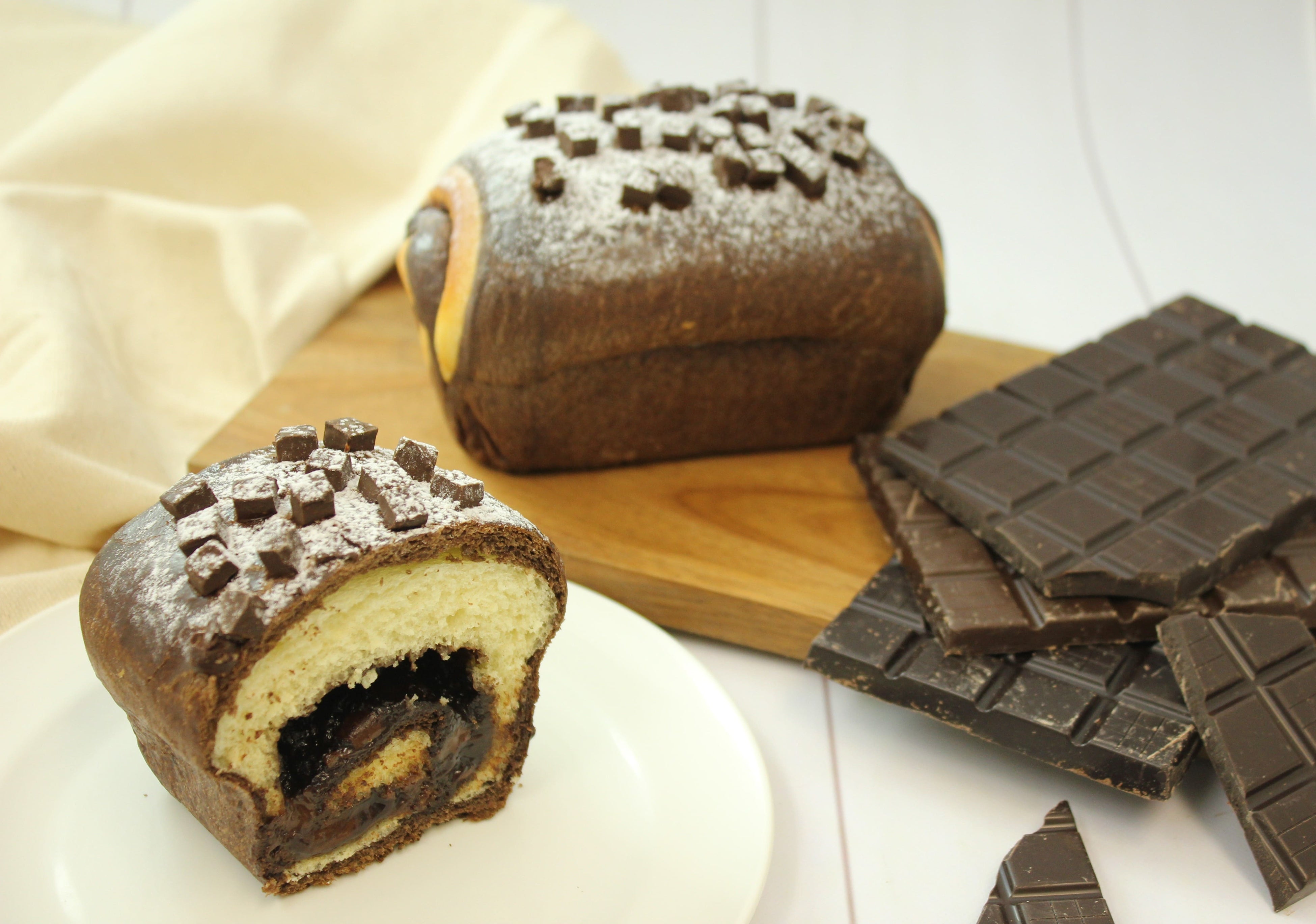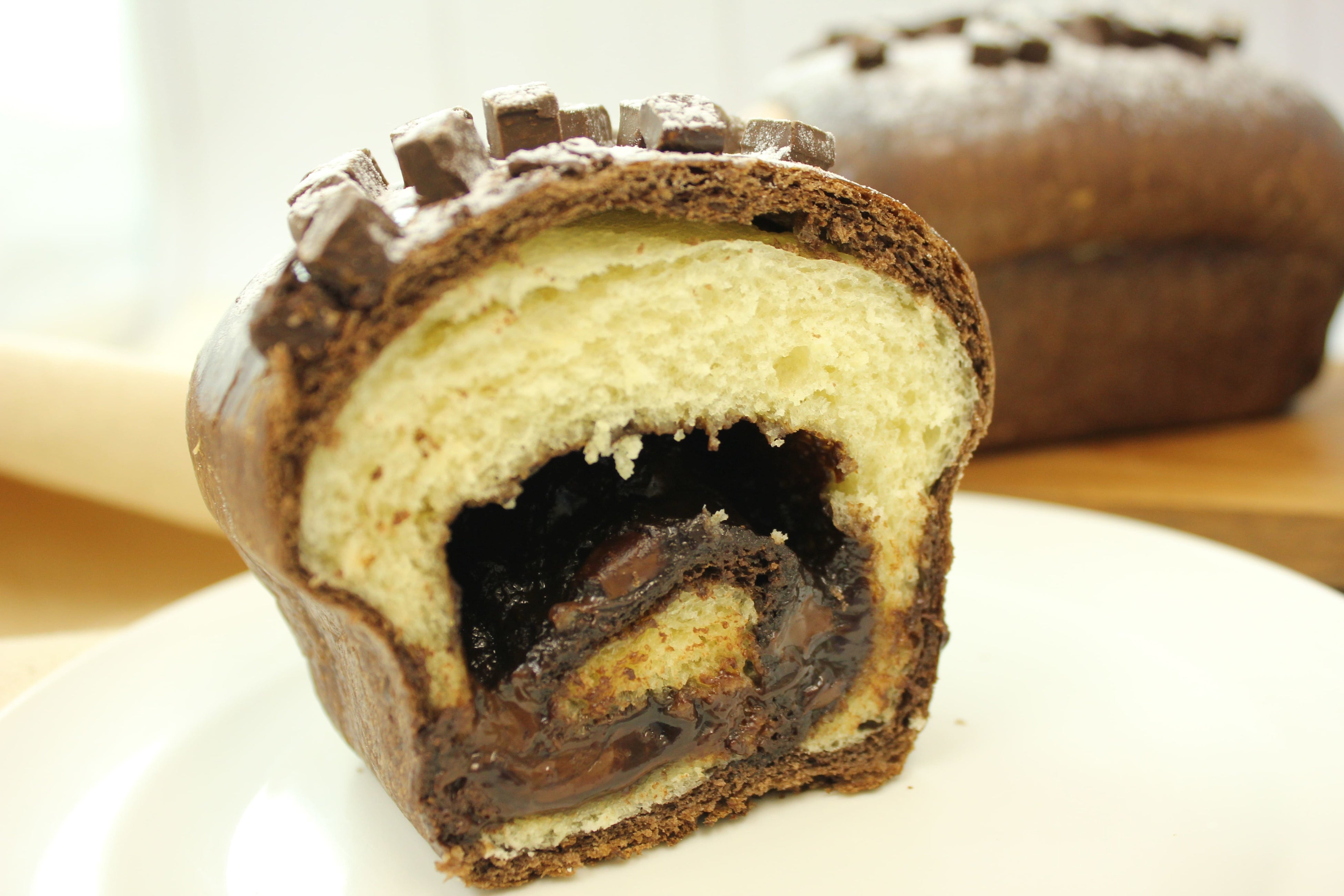 ふんわりさっくり食感が特長のスコーン×ブリオッシュのハイブリッド生地を2種類組み合わせ、チョコクリームとチャンクチョコを巻き込みました。濃厚なチョコクリームと、中と外の両方に使用したチャンクチョコのゴロゴロとした食感が美味しく、まるでケーキを食べるような満足感。
