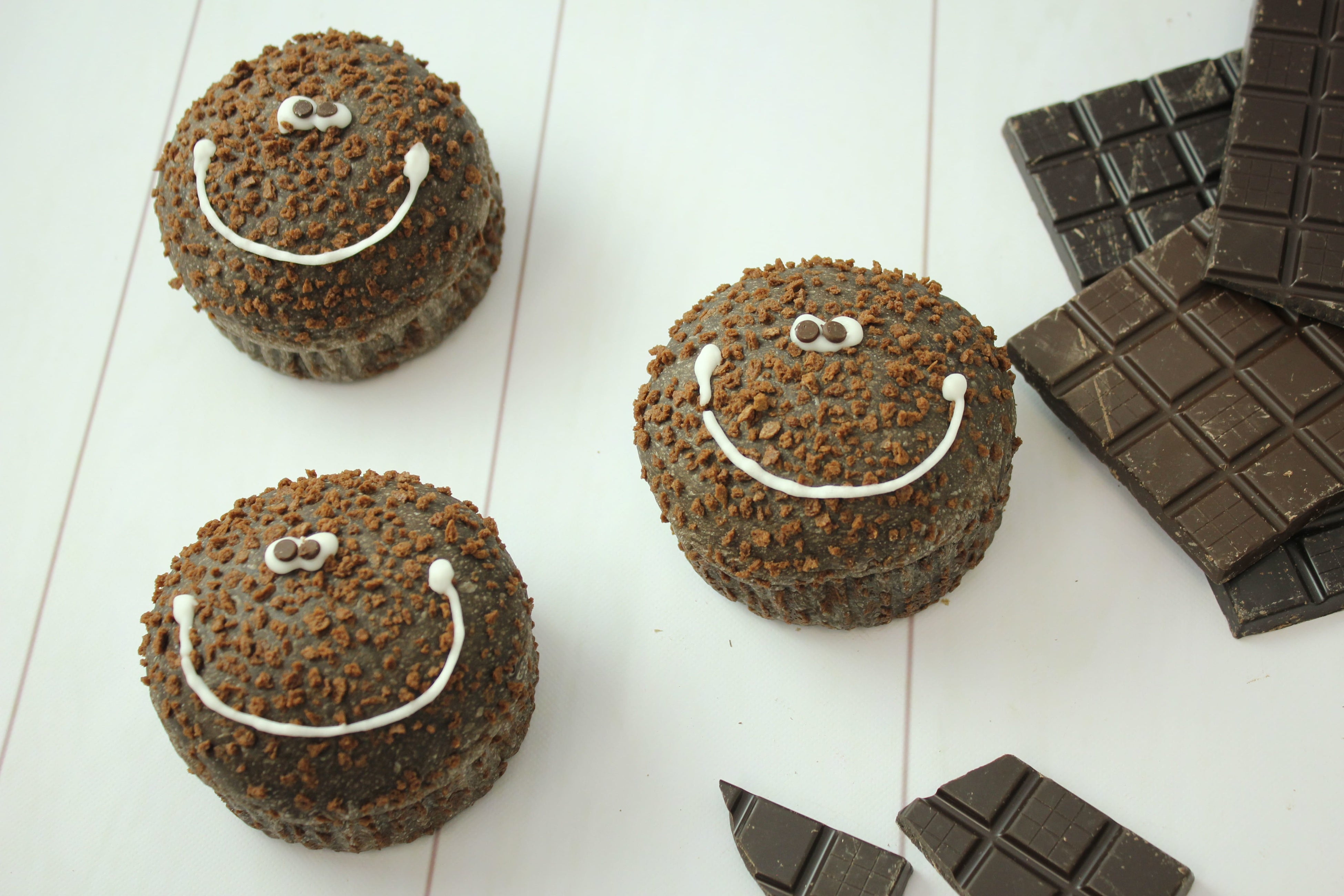 もちっとしたココア生地にビターチョコクリームを包み、チョコクランチをつけて、アイシングとチップチョコでキュートな顔を描きました。食べるのがもったいないほどの愛らしさと、クランチの食感もアクセントに。
