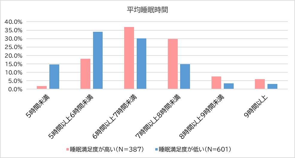 つづいて、「平均睡眠時間」を聞きました。睡眠満足度が高い人の66.7%が「6時間以上7時間未満」(37.0%)、「7時間以上8時間未満」(29.7%)取っているのに対し、満足度の低い人の64.0%は「5時間以上6時間未満」(33.9%)、「6時間以上7時間未満」(30.1%)と短い結果となりました。