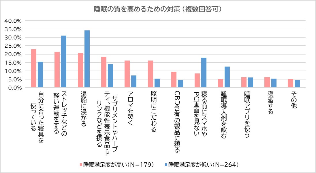 「睡眠の質を高めるために何か対策をしているか」聞きました。睡眠満足度に関わらず、半数以上が「特にしていない」(高い:53.7%、低い:56.1%)と回答。対策している人にどんな対策か聞いたところ、満足度が高い人の最多回答は「自分に合った寝具を使っている」(高い:22.9%、低い:15.5%)、低い人は「湯船に浸かる」(高い:20.7%、低い:34.1%)となりました。また、昨今注目されている「CBD含有の製品に頼る」は、満足度が高い人に9.5%いました。