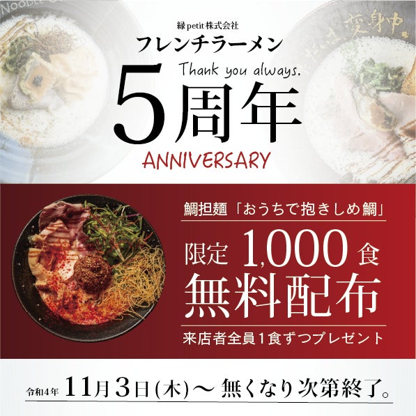 【店頭無料配布】 フレンチラーメンシリーズ5周年祭!数量限定で人気のご自宅で楽しめる鯛担麺セットを無料でご来店のお客様にプレゼント!【東京・大阪・神戸】