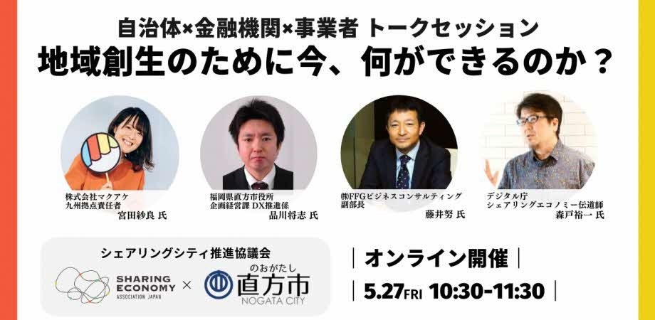 一般社団法人シェアリングエコノミー協会九州支部では、シェアリングエコノミーに着目し九州を盛り上げる仕組みを作ろうと経営に励む企業や自治体向けのイベントや勉強会を定期的に実施しております。5月27日(金)、一般社団法人シェアリングエコノミー協会九州支部では、自治体・金融機関・事業者をスピーカーにお招きし、「地域創生のために今、何ができるのか?」を共に考えるオンライン勉強会を実施致します。(https://share-kyusyu2.peatix.com/)シェアリングシティ推進協議会参加自治体数トップを誇る九州から、シェアによる新たな地域経済の仕組みづくりを進め、全国に先駆けた地域課題解決の事例を生み出すことを目指します。皆様のご参加を、心よりお待ちしております。