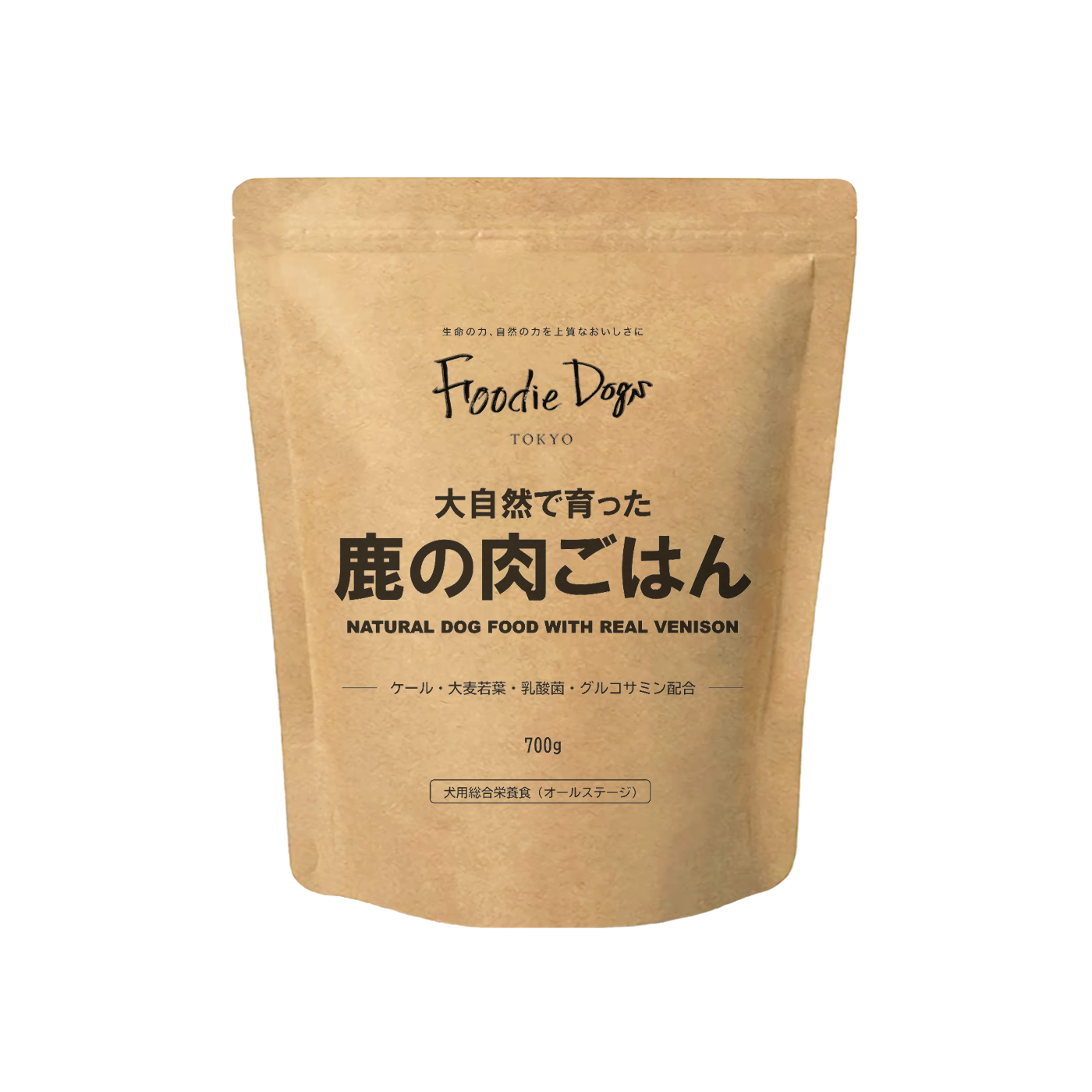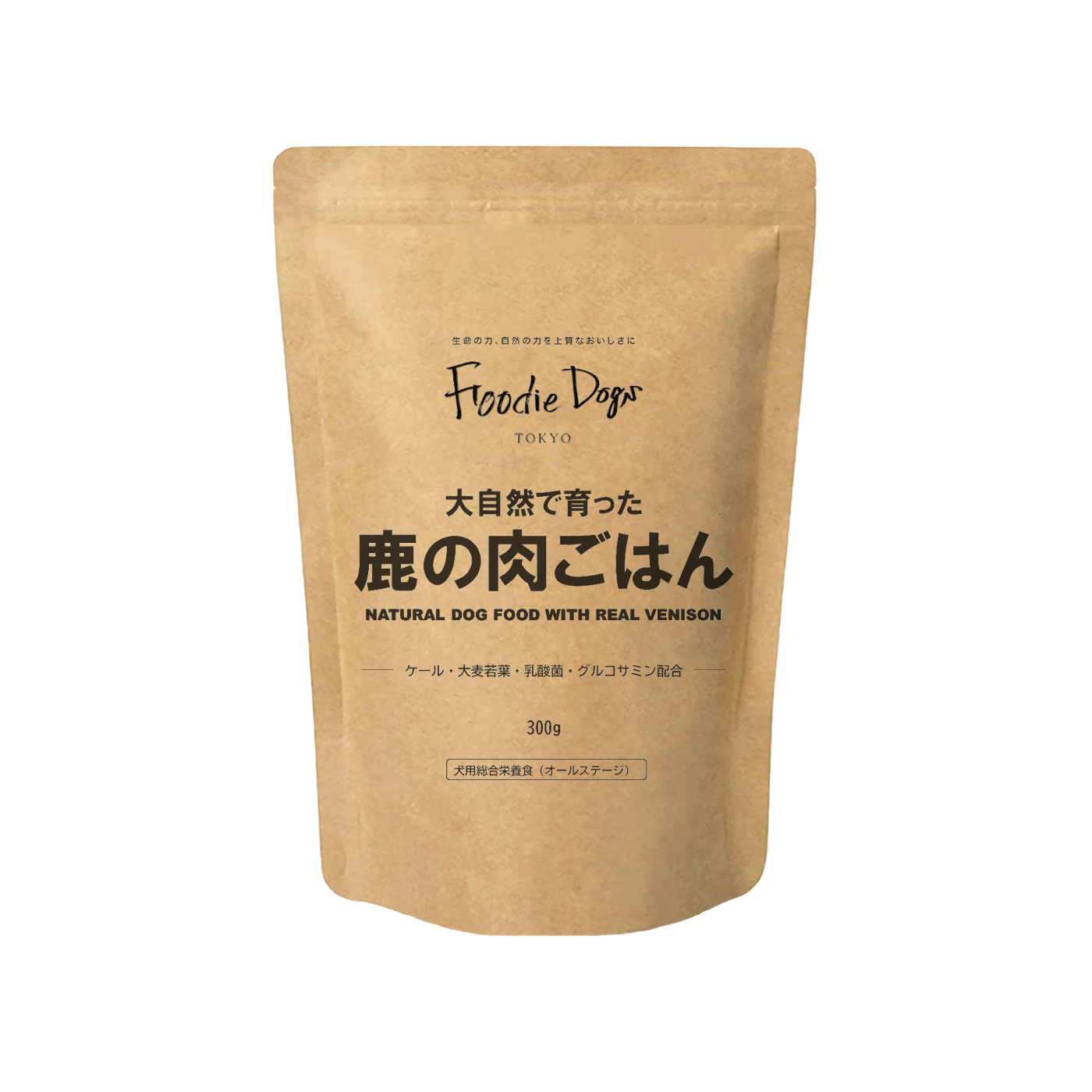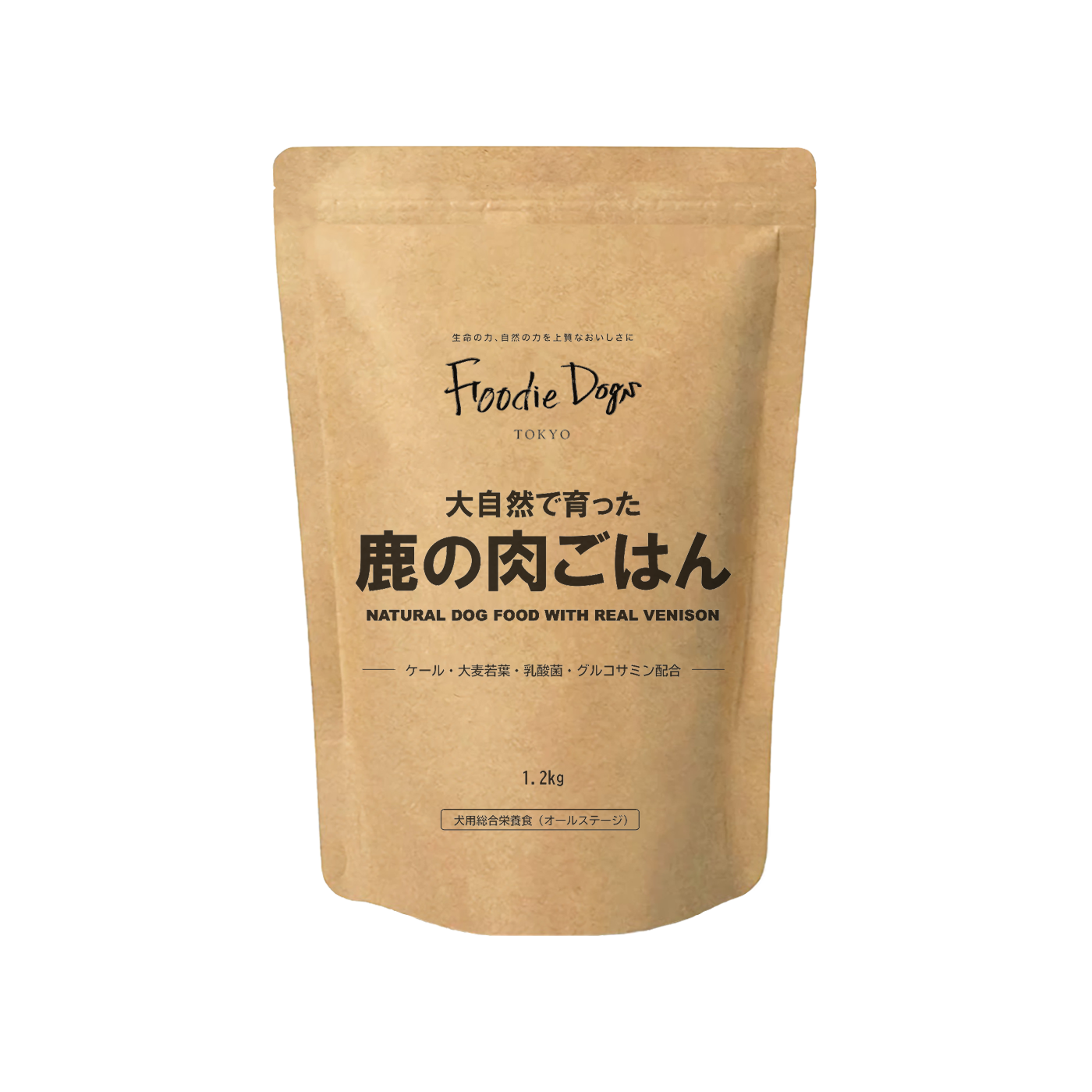 原材料:鹿肉、大麦、玄米、鰹節、ビール酵母、ラード、卵黄粉末、米油、コラーゲンペプチド、昆布、れんこん、さつまいも、にんじん、ブロッコリー、ケール、大麦若葉、乳酸菌、セレン酵母、グルコサミン、L-トレオニン、 ミネラル類(リン酸三カルシウム、卵殻未焼成カルシウム、塩化ナトリウム、塩化カリウム、グルコン酸亜鉛、ピロリン酸第二鉄、グルコン酸銅)、ビタミン類(ビタミンA、ビタミンD、ビタミンE、ビタミンB2、ビタミンB12、パントテン酸カルシウム)、酸化防止剤(ローズマリー抽出物、ミックストコフェロール)