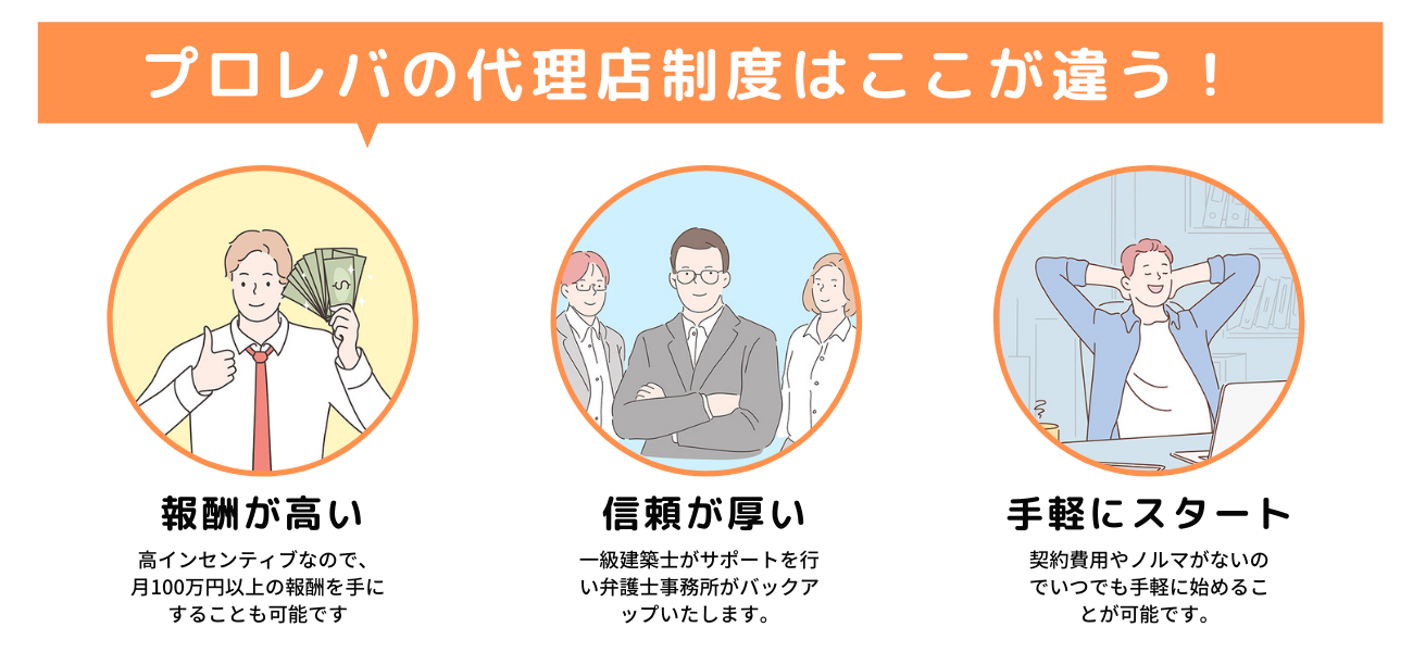 一級建築士がサポートを担当し弁護士事務所が監修する。高い認定率と良心的な手数料でサービスを提供している『プロレバ』をより多くのお客様に知っていただくためには、代理店様のお力が必要です。