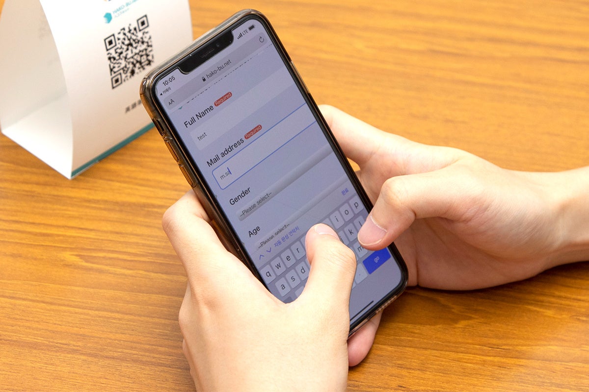 3. お客様が入力を完了させると、お客様のスマートフォン上にQRコードが生成されます。店員はアプリを使ってお客様のスマートフォン上のQRコードを読み取ります。画面の案内に沿ってお客様の購入した商品情報と紐づけすれば、EMS配送伝票が出力できます。