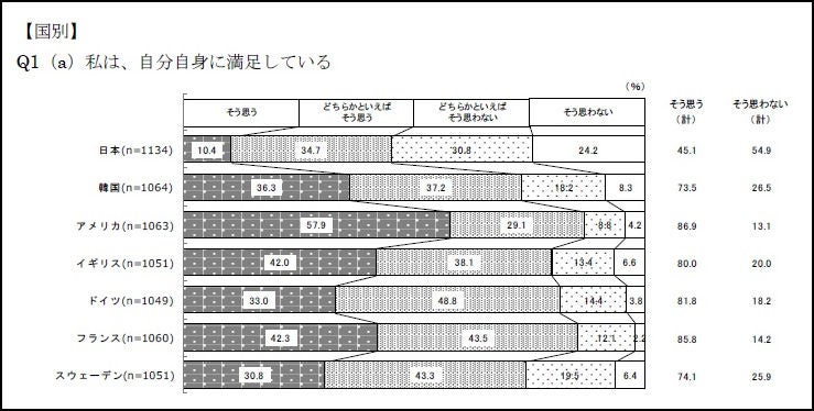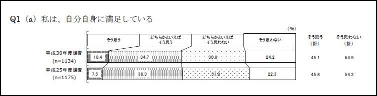 令和元年6月に内閣府が行った「我が国と諸外国の若者の意識に関する調査 (平成30年度)」によると、日本では、半分以上(54.9%)の若者は自分自身に満足しておらず、また自分自身の満足度は、5年前より下がっているという結果が出ています。