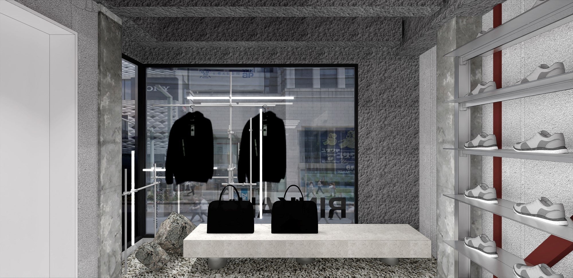 内装設計はKENTA NAGAI STUDIOの永井健太が担当。鉄骨がむき出しになった古いビルの躯体とアルミ素材の新たな什器を対比させることにより、中古と新品の両方を取り扱うRINKANのコンセプトを表現させています。