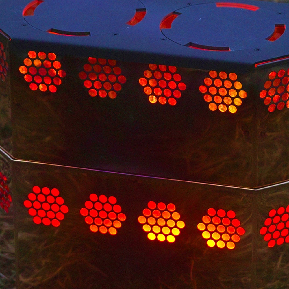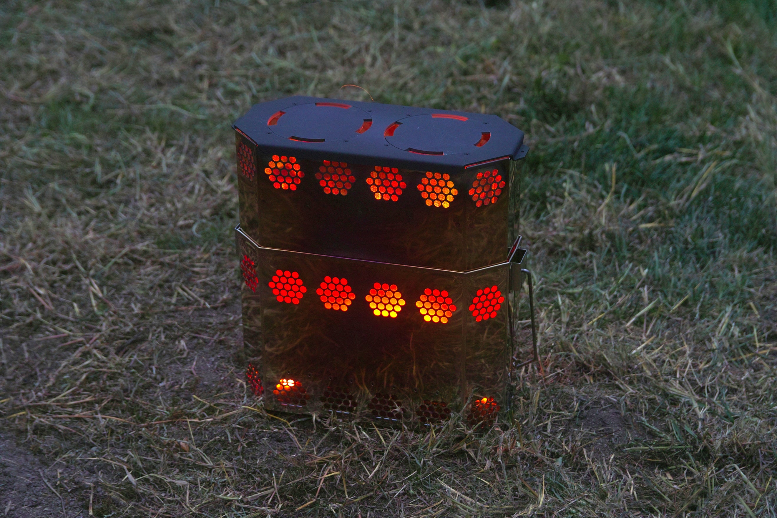 全面に配置された六角の窓からは、赤熱した燃焼室や燃焼筒内の炭の炎を見ることができます。