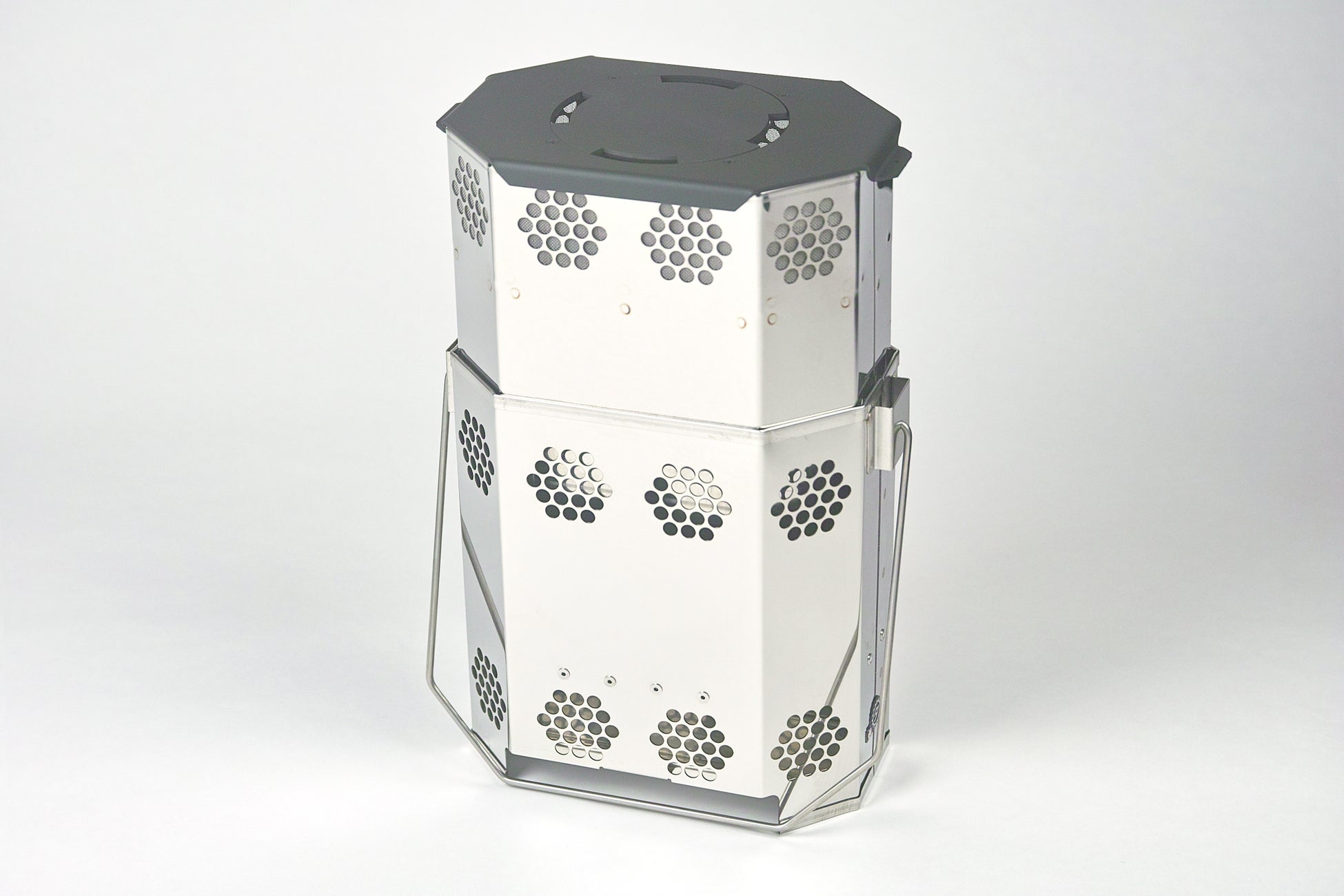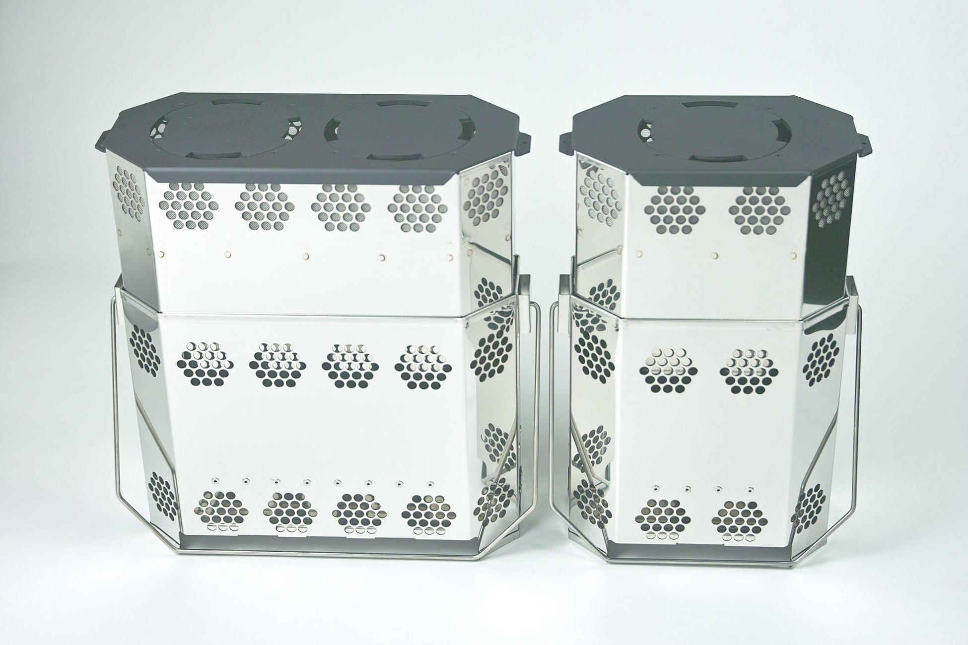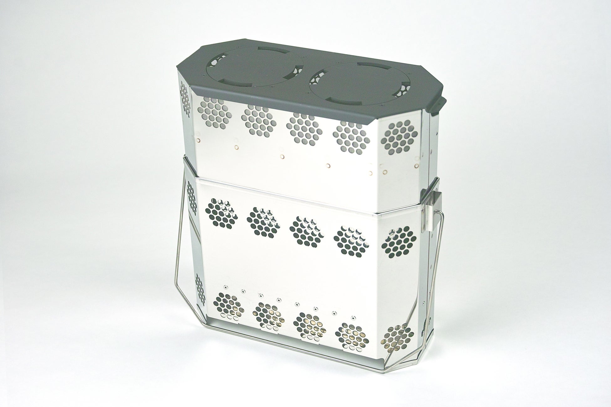 『ハンゴーストーブ・炭ロボ』は燃焼筒を本体内部に収納することが可能。大きいなりにも、できる限りコンパクトになるように設計。