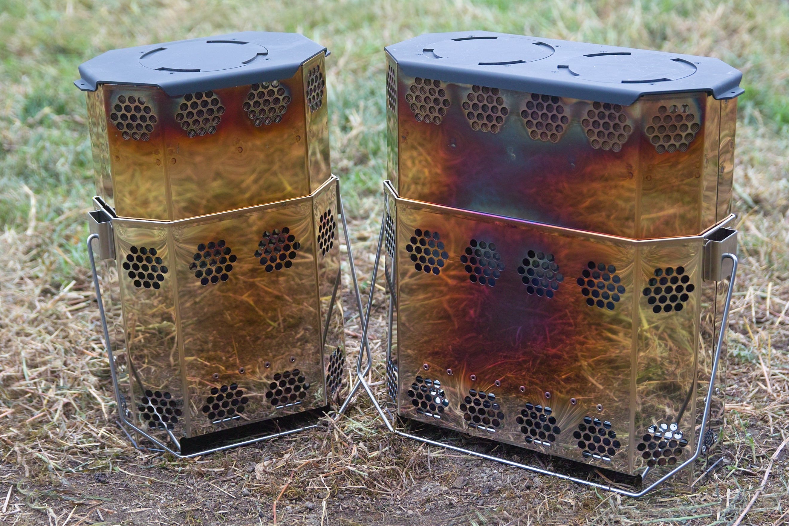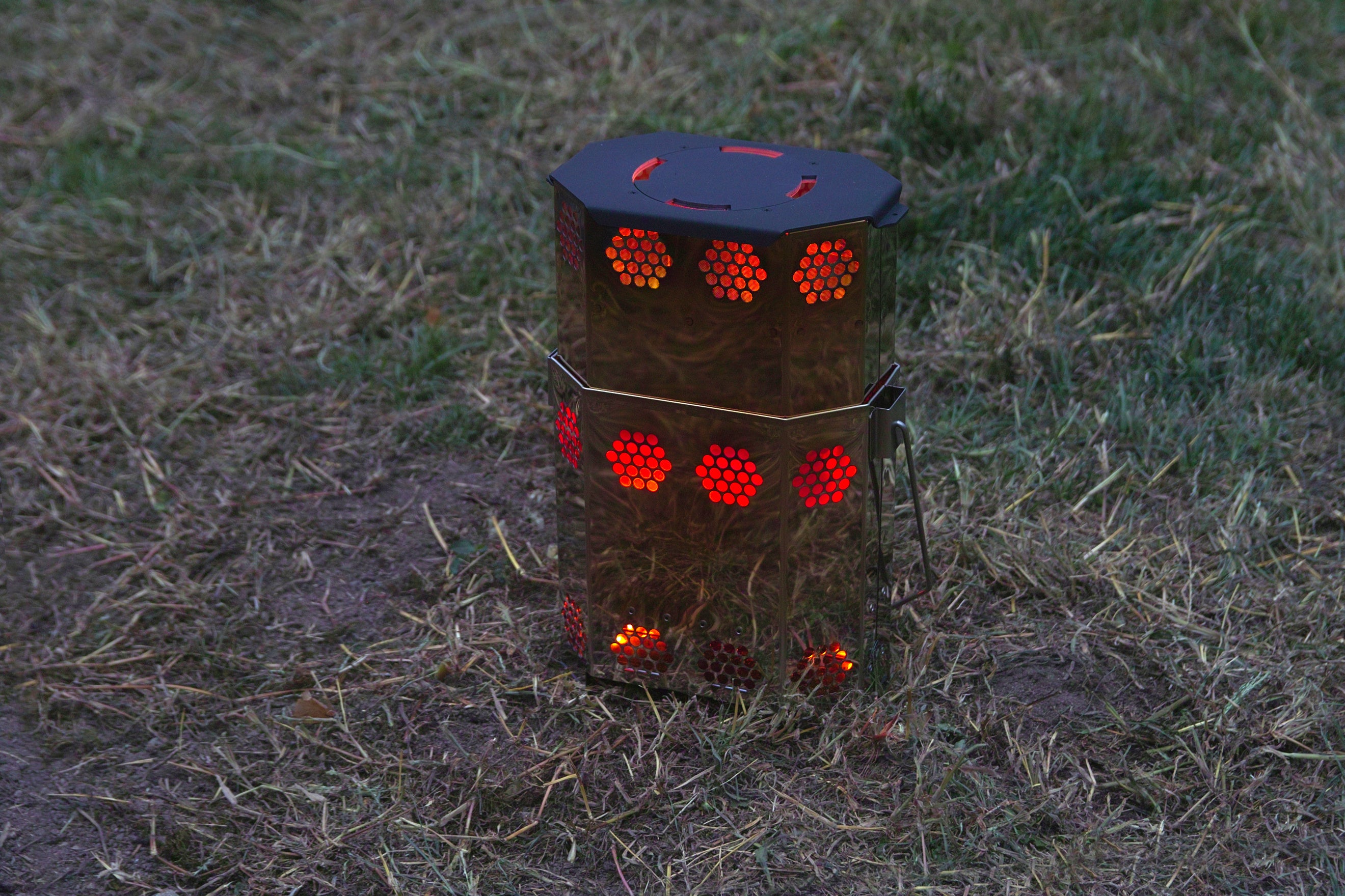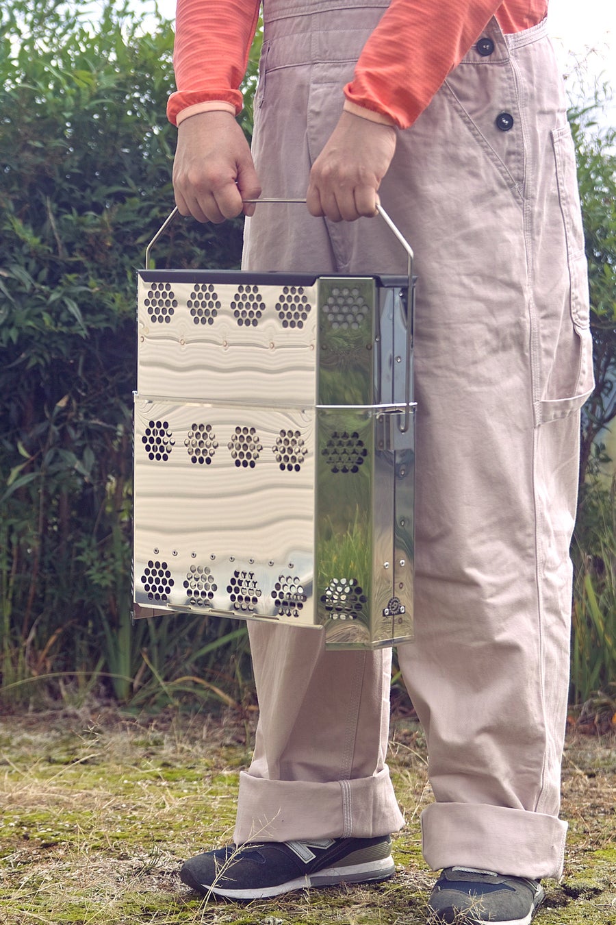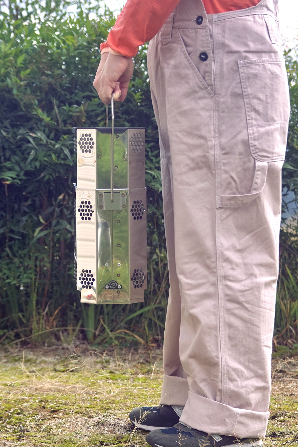 『ハンゴーストーブ・炭ロボ』は燃焼筒を本体内部に収納することが可能。大きいなりにも、できる限りコンパクトになるように設計。