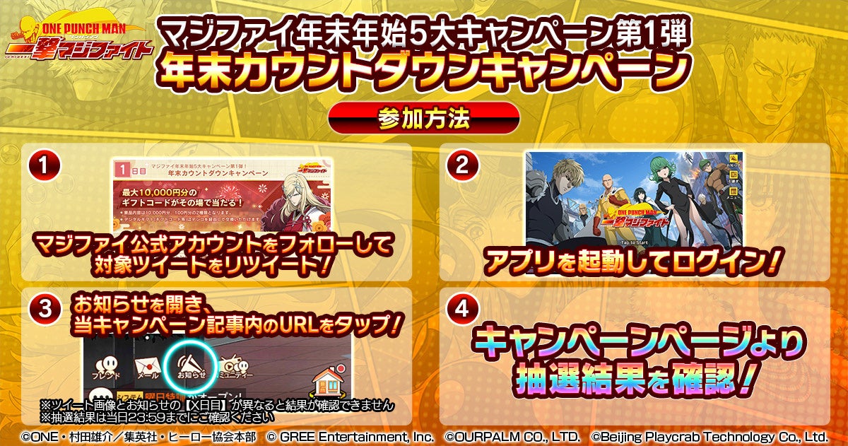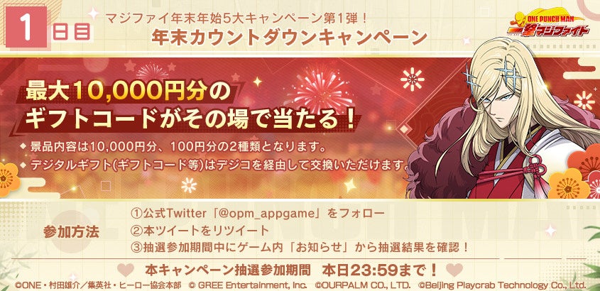5大キャンペーンの第1弾は12月24日(金) から 12月31日(金)まで実施中の「年末カウントダウンキャンペーン」。公式Twitterをフォロー&キャンペーンツイートのRTをすることで参加可能です。当選結果はゲーム内のお知らせのURLからすぐ確認できるキャンペーンです。抽選は1日1回参加可能、いますぐ参加しよう!