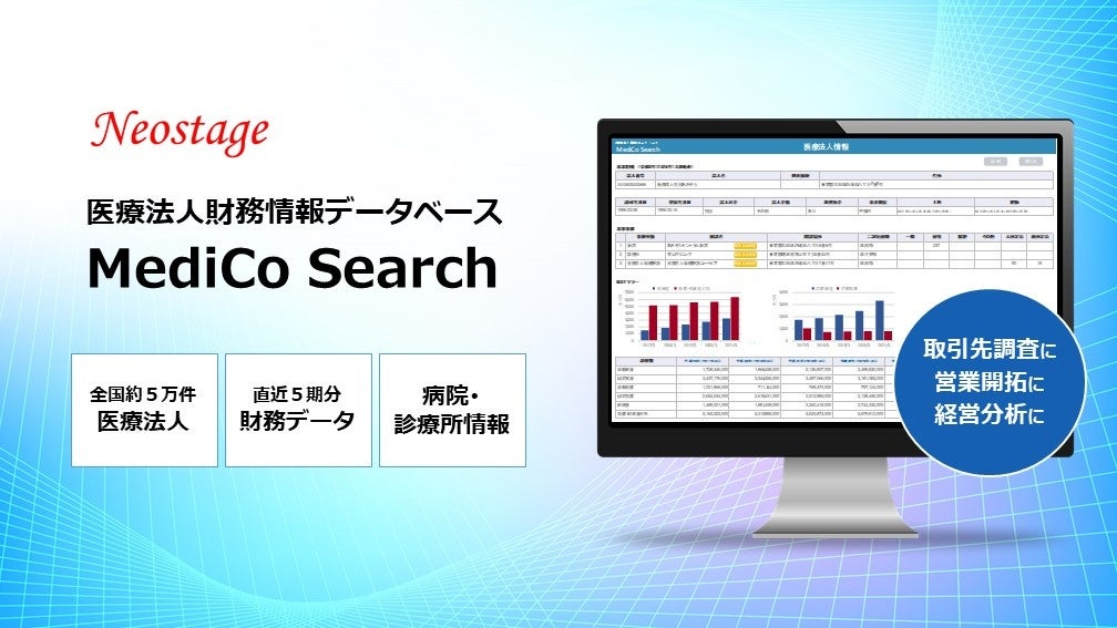 株式会社ネオステージが医療法人財務情報データベース「MediCo Search(メディコサーチ」の機能を拡充しました。