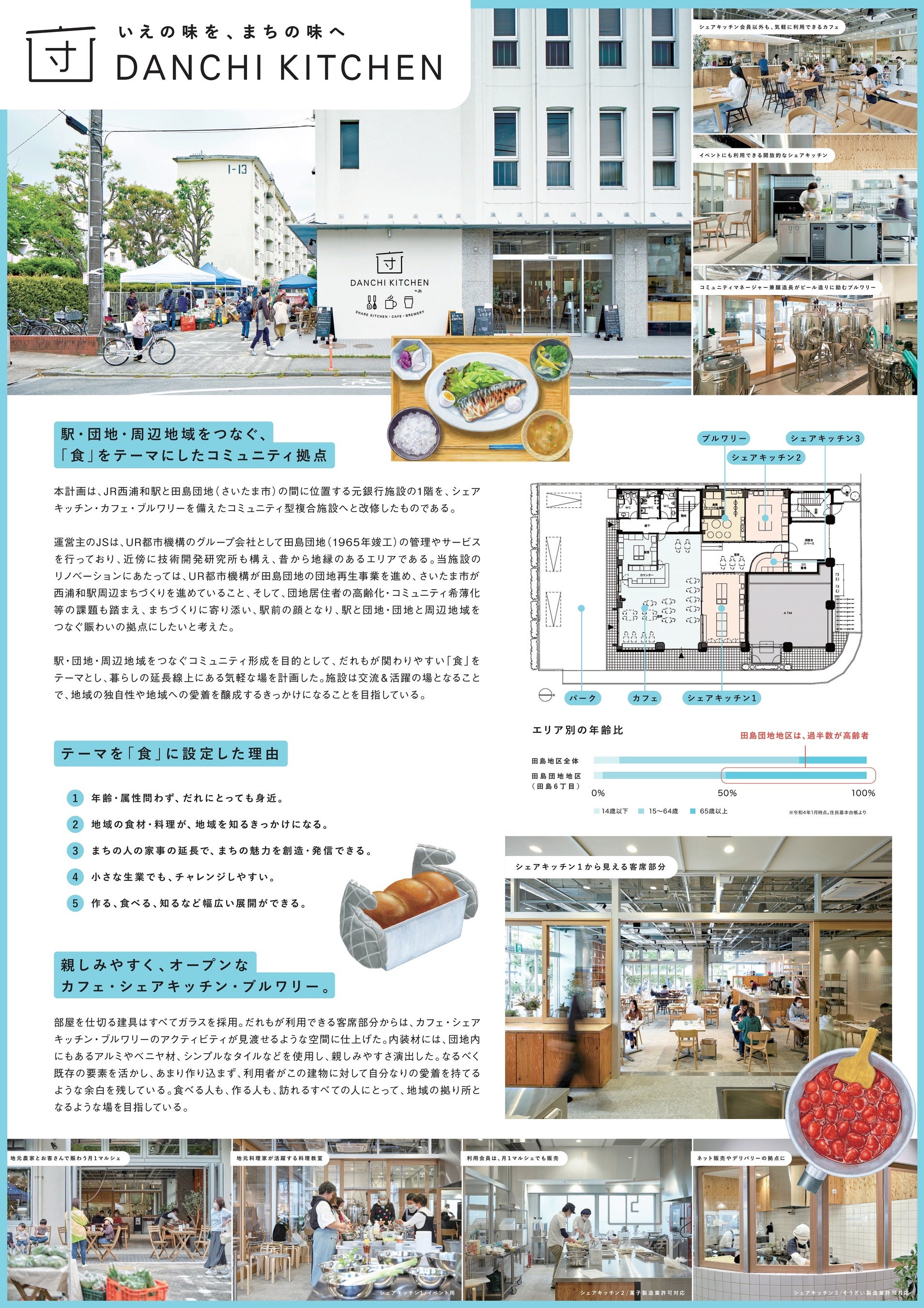 「団地内外の住民が気軽に利用できる場として、立地、既存建物の佇まい、機能、それぞれの空間の広さ等、全てが、日常感がありながら丁寧なデザインによってうまく組み合わされ、全体として魅力的な場が生まれている。どのように企画を進めて行ったのか気になるが、例えば単なるシェアキッチンではなく菓子製造ができるキッチンとすることで、小さなチャレンジを支えることが想定されているなど、非常に細かやかに企画がなされていることも評価した。」