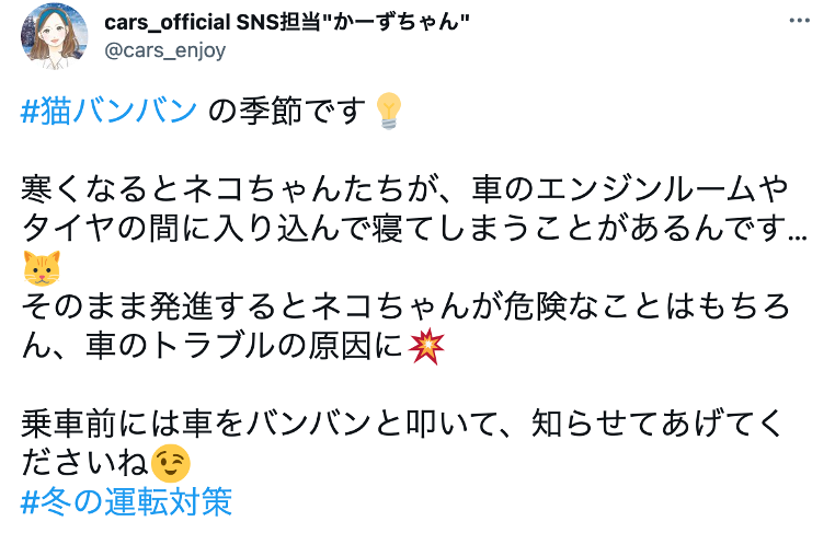 - カーライフ専用『cars_official SNS担当 "かーずちゃん"』( https://twitter.com/cars_enjoy/ )